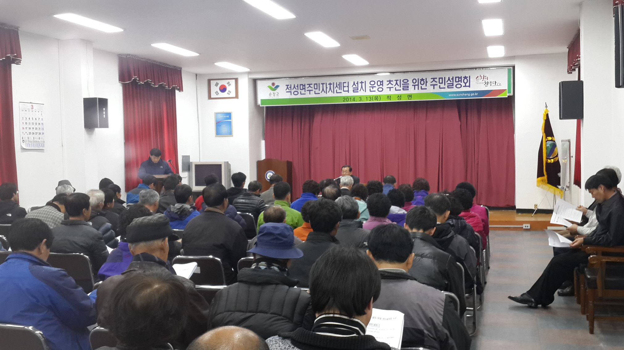 - 적성면(면장 설주원)은 13일 적성면사무소에서 주민자치위원회(이하 자치위) 출범을 위한 주민설명회를 가졌다. 이번 주민 설명회에는 정성균 순창군 의원을 비롯해 관내 유관기관장 및 주민 70여명이 참석한 가운데 열렸다. -2014. 3. 18-