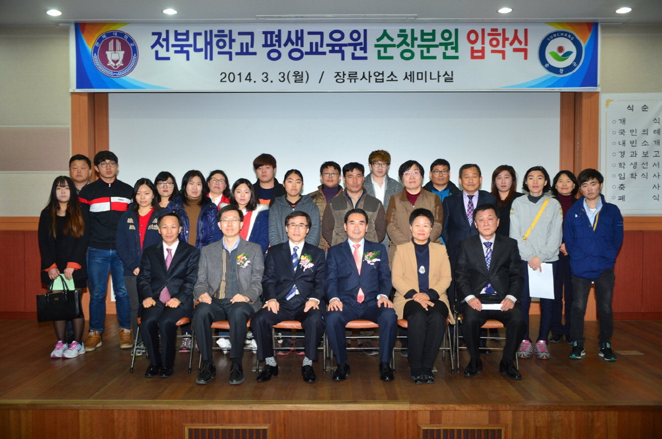 - 전북대학교 식품생명공학과 순창분원입학식이 3일 저녁 장류사업소 세미나실에서는 황숙주 군수, 최영일 군의장을 비롯 전북대 조좌형 평생교육원장, 김용석 순창분원장, 입학생, 재학생, 졸업생과 가족 등 100여명이 참석한 가운데 열렸다. 순창군은 학생들에게 4학년 졸업할 때까지 학기당 등록금 120만원 중 50%인 60만원을 군비로 지원하고 있어 큰 호응을 얻고 있다. -2014. 3. 3-