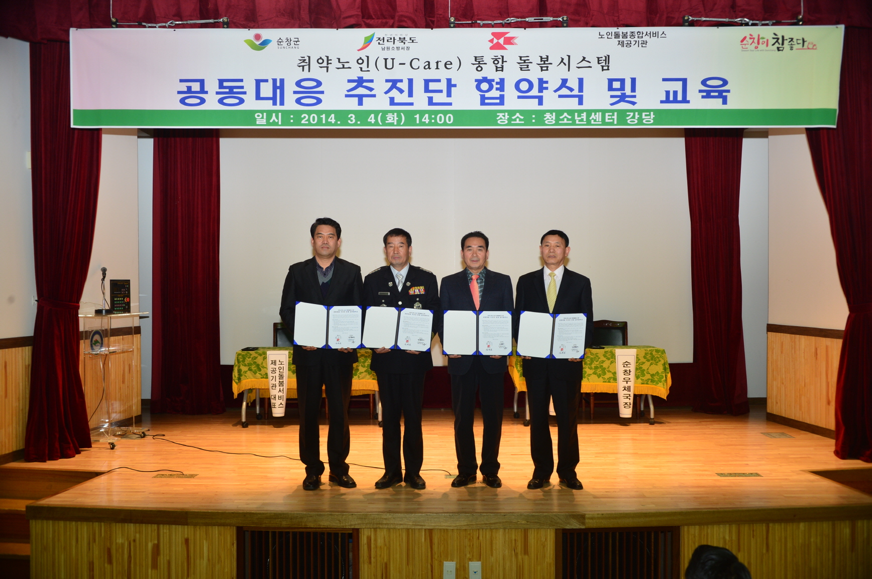 - 순창군은 4일 청소년센터에서 순창군과 남원소방서, 순창우체국, 노인돌봄서비스 제공기관(장기요양기관)을 포함한 11개기관과 독거노인 응급안전(U-care)시스템 사업의 관리체계 구축과 다양한 복지서비스 제공을 위한 취약노인돌봄시스템 공동대응추진단을 발족했다. 이날 협약식은 황숙주 순창군수와 김승태 남원소방서장, 김영균 순창우체국장, 8개 노인돌봄종합서비스 제공기관 대표 한승연 지역자활센터장이 협약서에 서명하고 응급안전시스템을 적극 활용하여 정보 공유와 함께 공동대응키로 했다. -2014. 3. 4-