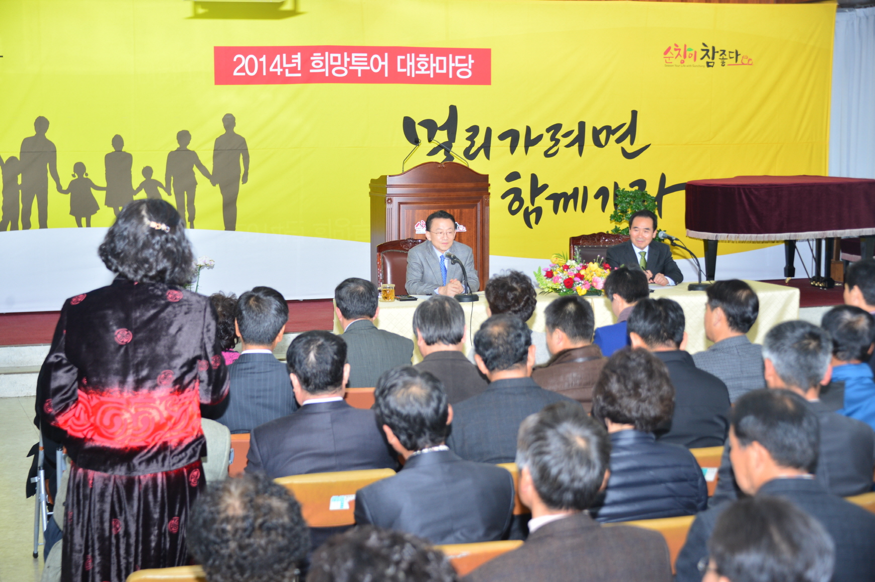 - 김완주 지사가 28일 순창군을 방문해 ‘도민들과 희망 이어가기 대화의 마당’을 가졌다. 순창군을 방문한 김 지사는 순창군청 영상회의실과 회의실에서 지역리더와 조력자 등 120여명이 참석한 가운데 ‘멀리 가려면 함께 가라’는 주제로 대화마당을 가졌다. -2014, 2. 28-