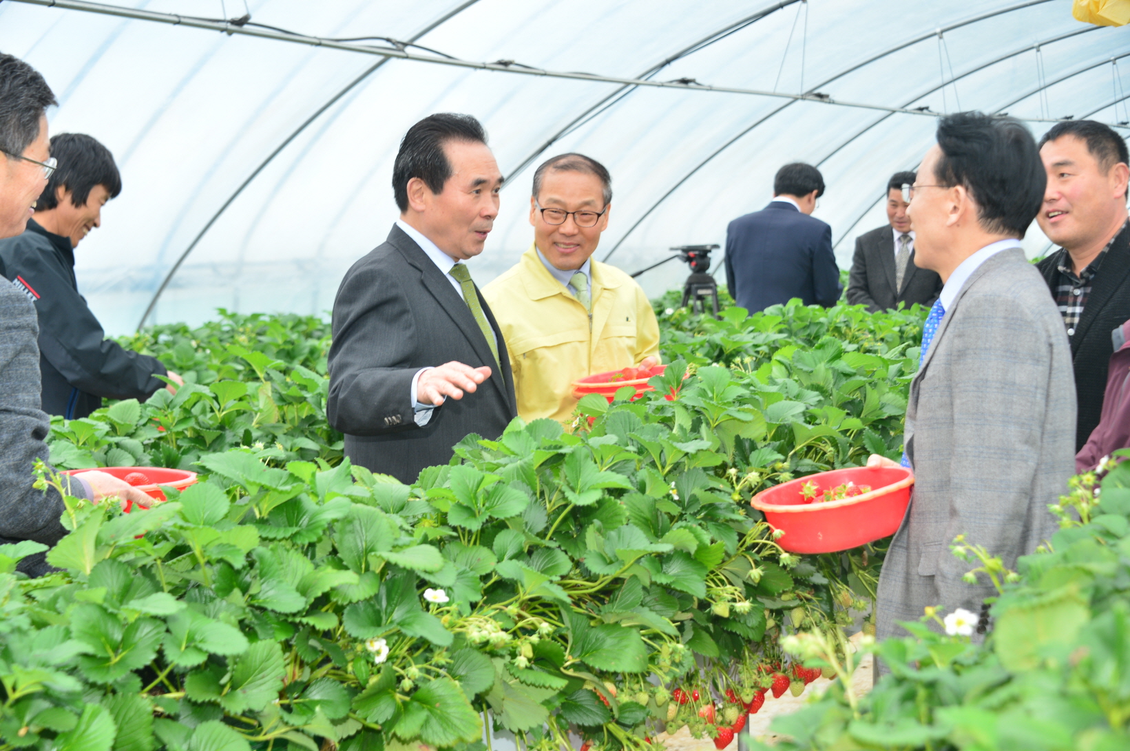 - 황숙주군수와 김 지사는 ‘고설재배’ 신기술을 도입해 고소득을 올리고 있는 금과면 딸기 작목반 홍영도(60) 농가의 현장을 방문하여 딸기수확체험과 순창지역 통합마케팅조직 추진 현황에 대한 의견도 주고 받았다. -2014, 2. 28-