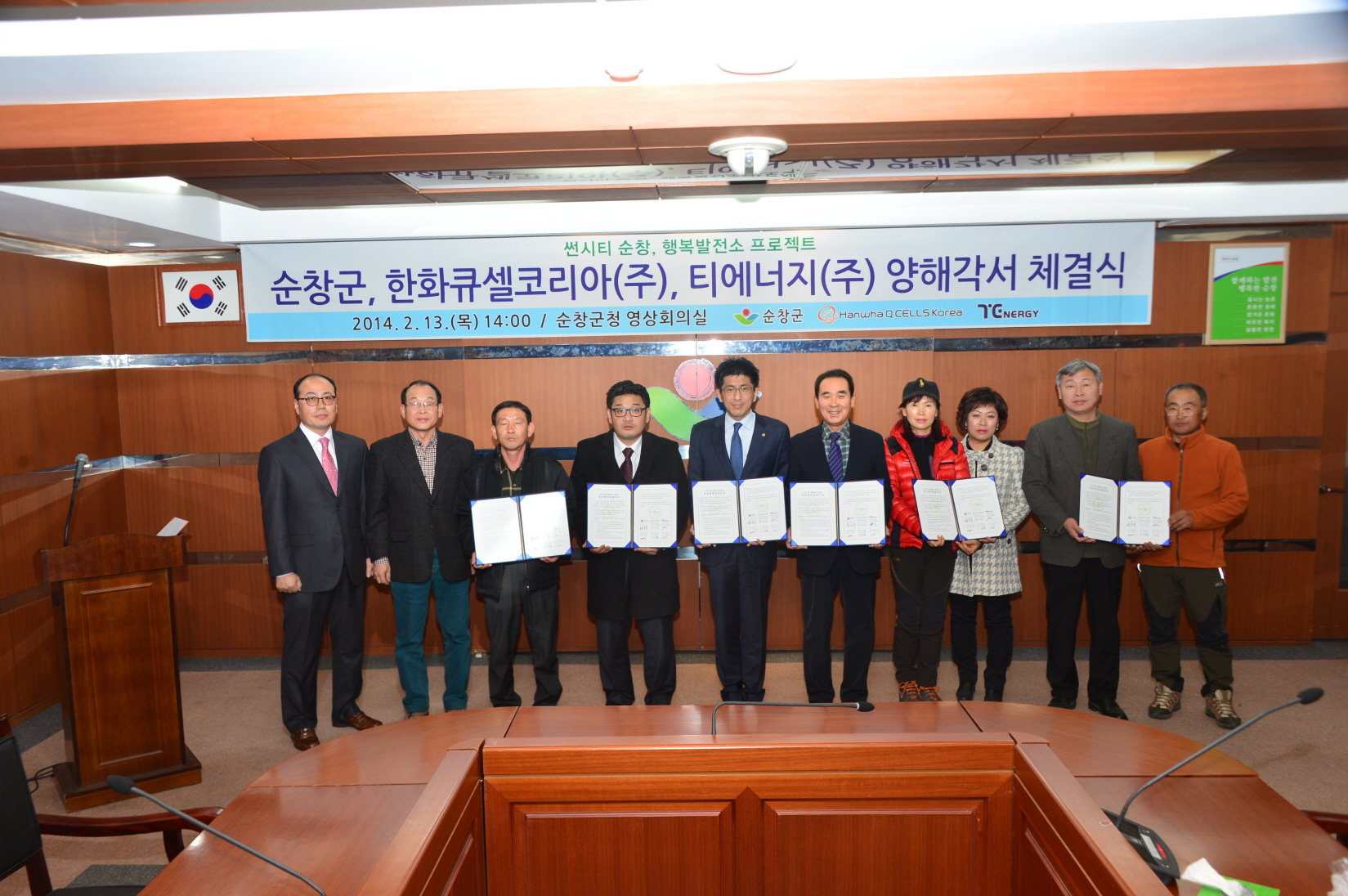 - 순창군은 정부의 신재생에너지 보급정책에 발 맞춰 저탄소 녹색성장 실현을 위해 13일 군청 영상회의실에서 태양광 발전시설 전문기업인 한화큐셀코리아(주), 주식회사 티에너지와 투자 양해각서를 체결했다. 이날 체결식에는 황숙주 순창군수와 한화큐셀코리아(주) 김승무 상무, 주식회사 티에너지 김경룡 대표, 농촌마을 리모델링시범사업 방축마을 손현기 대표와 100% 에너지자립 썬시티 금판마을 이선형 대표, 클린순창 웰빙마을 조미경 대표 등 관계자 12명이 참석했다. -2014, 2. 13-