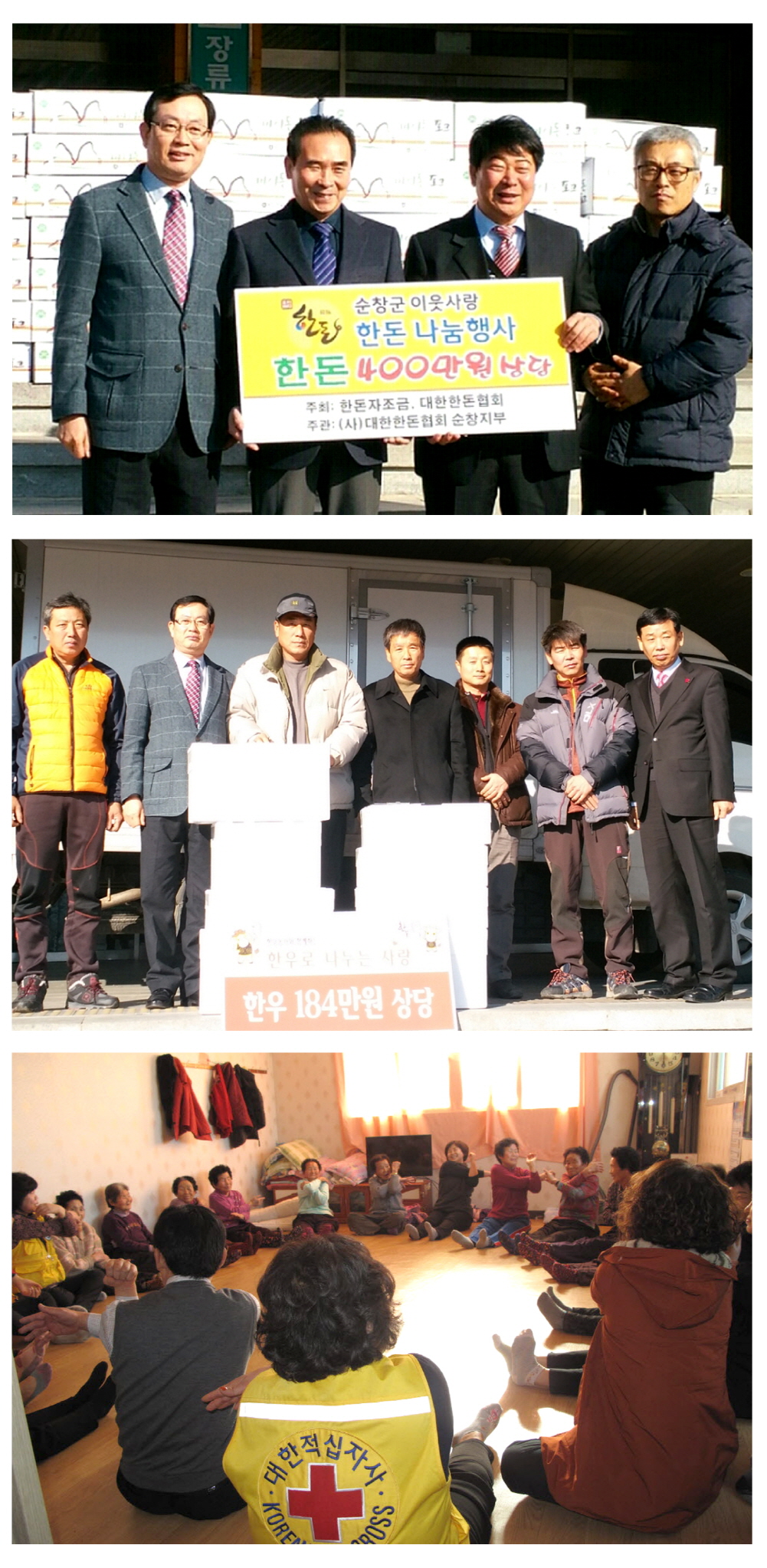 - 다가오는 설명절을 앞두고 관내 저소득층과 사회복지시설에 대한 나눔의 손길이 이어지고 있다. 23일 대한한돈협회 순창지부(지부장 이윤택)는 돼지고기 750kg(400만원 상당)를, 전국한우협회 순창군지부(지부장 이성연)는 소고기 80kg(184만원 상당)를 순창군에 전달했다. 또 전북은행 순창지점(지점장 김길문)에서는 관내 저소득층 100세대에게 전해 달라며 3만원 상당의 생필품이 들어있는 선물꾸러미 상자 100개(300만원 상당)를, 유등면 기관‧사회단체와 독지가 등은 설 명절을 맞이해 저소득 소외계층에 전달해 달라며 현금 130만원을, 적십자봉사회에서는 마을 경로당과 소외계층을 방문해 청소하는 등 봉사활동을 실시했다. -2014, 1. 24-