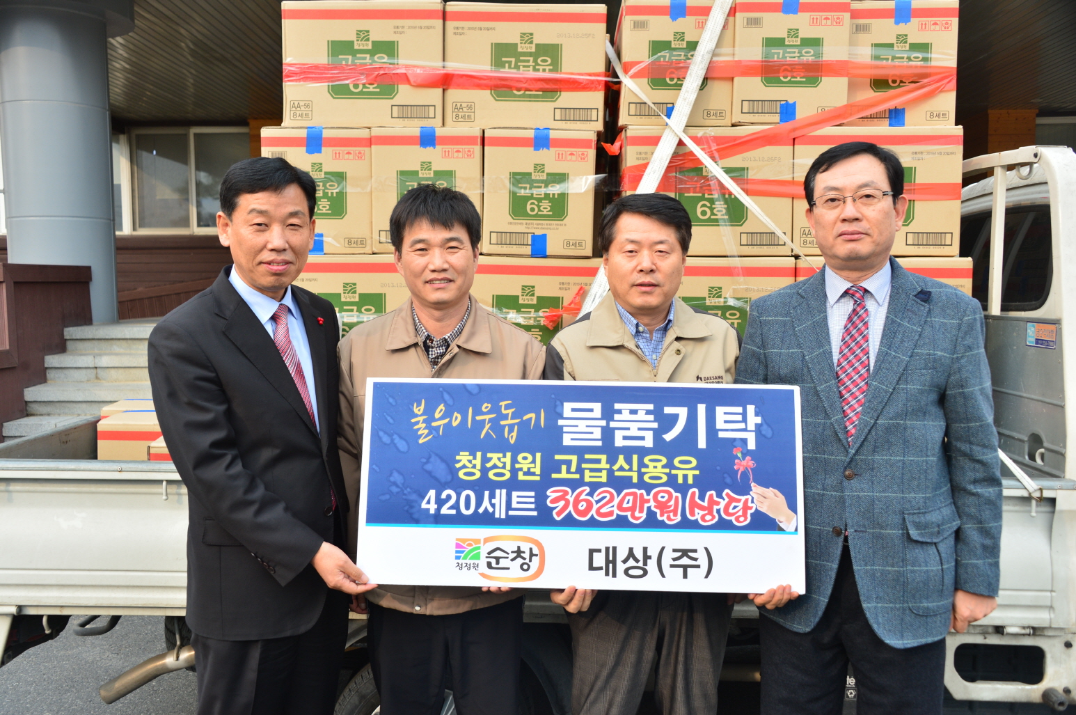 - 대상(주) 순창공장(공장장 이상주)은 20일 설날명절을 맞아 순창관내 어려운 이웃에게 전달해 달라며 자사 선물세트 420개를 순창군청에 전달했다. 전달된 선물세트는 지난달 7일 대상(주) 순창공장에서 실시한 ‘청정원노사공동바자회’를 통해 마련된 것으로, 이중 1,200만원은 초록우산 어린이재단에 순창 관내 청소년들을 위한 ‘청소년 희망장학금’으로 전달했다. -2014, 1. 20-
