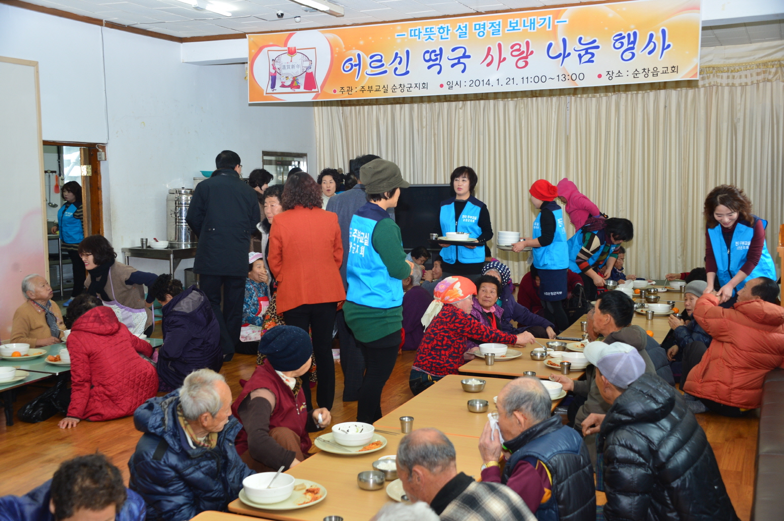 - 전국주부교실 순창군지회(회장 김인자) 회원 20여명은 21일 순창읍교회에서 ‘따뜻한 설명절 보내기 어르신 떡국사랑 나눔행사’를 실시했다. 눈이 오는 추운날씨에도 불구하고 회원들은 시종일관 따뜻한 미소로 100여명의 어르신들에게 떡국을 대접하며 봉사를 실천했다. -2014, 1. 21-