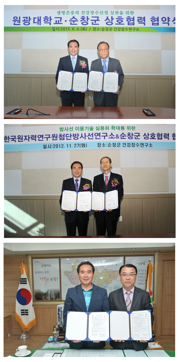 - 순창군이 힐링산업 순창거점을 위해 양․한방 융합형 힐링거점 조성 사업의 단계별 추진전략 마련하고 있다. 이를 위해 한국농촌경제연구원 주관으로 지난해 10월부터 올해 5월까지 기본계획수립 및 타당성조사 연구용역을 추진 중에 있다. 그동안 순창에 맞는 힐링산업 추진을 위해 원광대학교, 한국원자력연구원, 건양대학교 등 전문기관과 협약을 체결하고 다각적인 협력체제를 구축해 운영하고 있다. -2014, 1. 22-
