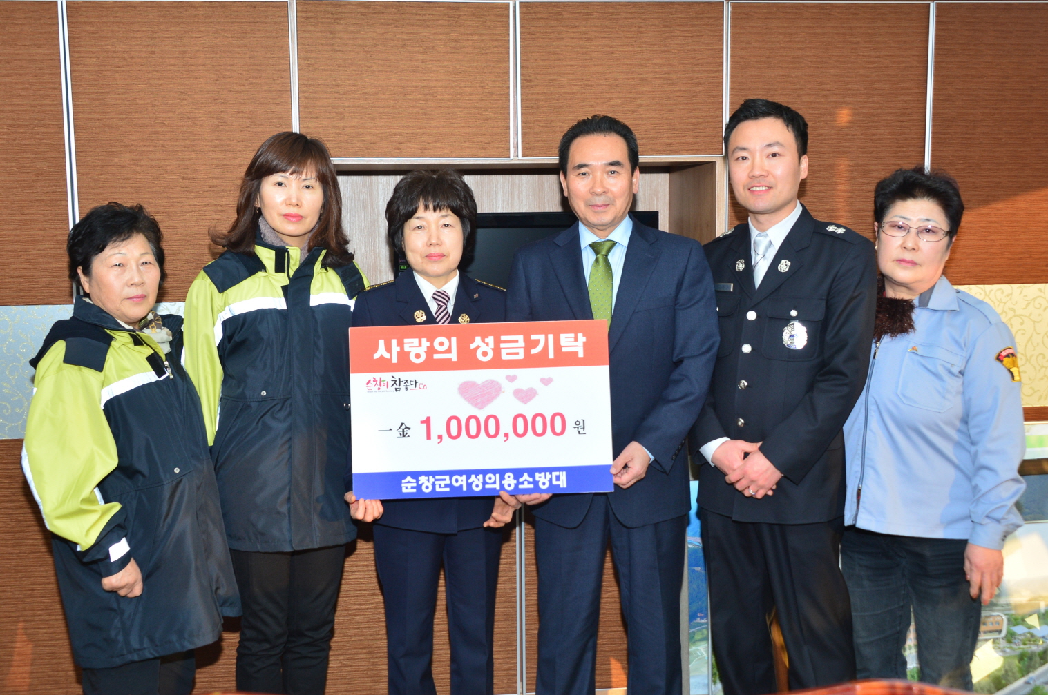 - 순창군 여성의용소방대(대장 채진자)는 회원들이 회비를 아껴 모은 100만원의 성금을 추운겨울 어려운 이웃들에게 써달라며 황숙주 군수에게 전달했다. 순창군은 여성의용소방대의 취지를 살려 관심과 배려가 필요한 분들에게 쓰여질 수 있도록 전북사회복지공동모금회에 전달할 예정이다. -2014, 1. 15-