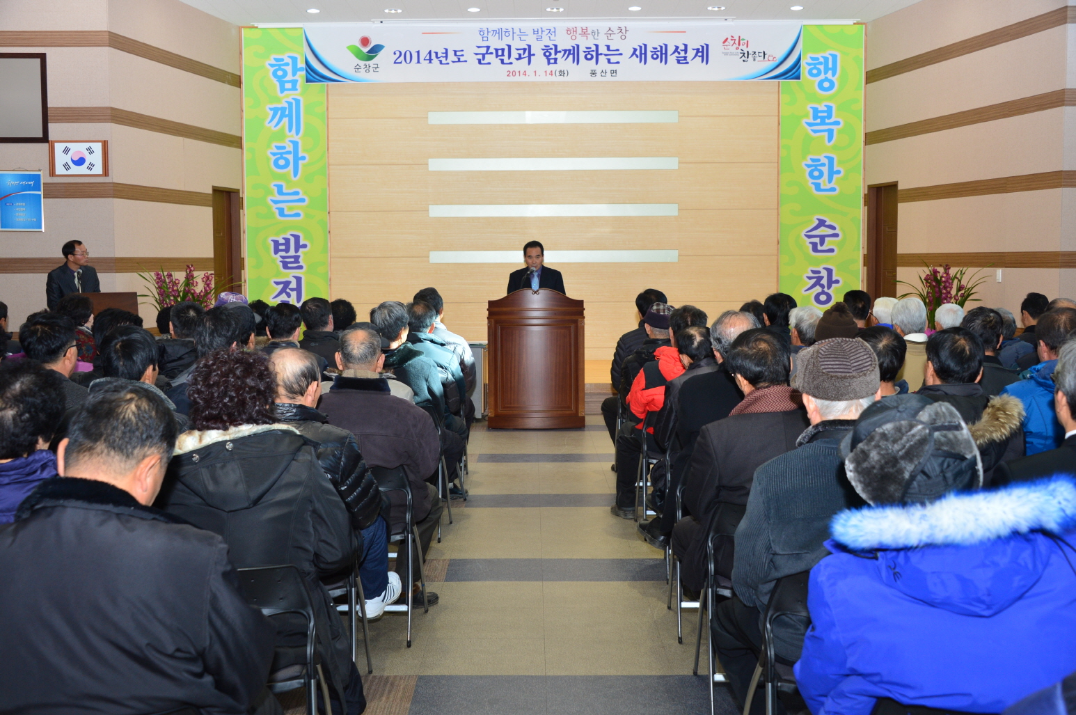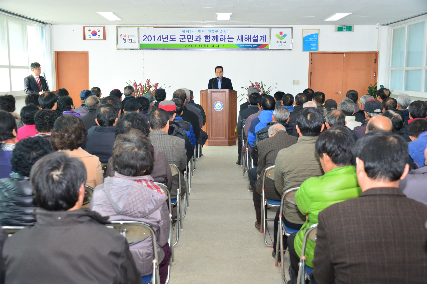 - 14일 황숙주 순창군수는 풍산면 주민과 새해 군정설명회를 갖고 올 한해 군정방향을 설명하며 주민과의 소통의 시간을 가졌다. 17일에는 복흥과 쌍치, 20일에는 팔덕과 구림, 27일에는 적성과 인계면이 예정되어 있다. -2014, 1. 14-