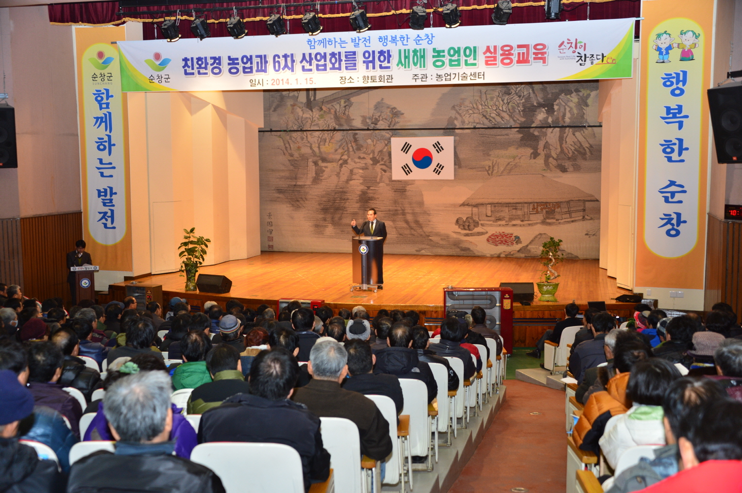 - 순창군 농업인과 함께하는 2014년 새해 농업인 실용교육이 15일 향토관에서 500여명의 농업인들이 참석한 가운데 박영범 지역농업 네트워크 대표의‘친환경 농업의 필요성과 6차 산업화’란 주제로 첫 교육이 시작됐다. 새해 농업인 실용교육은 다음달 28일까지 순창군 농업인 1만1600여명을 대상으로 농업인 마인드 향상, 농업의 6차 산업화, 친환경 농업 및 품목별 재배기술 등의 과정으로 11개 읍면을 순회하면서 진행된다. -2014, 1. 15-