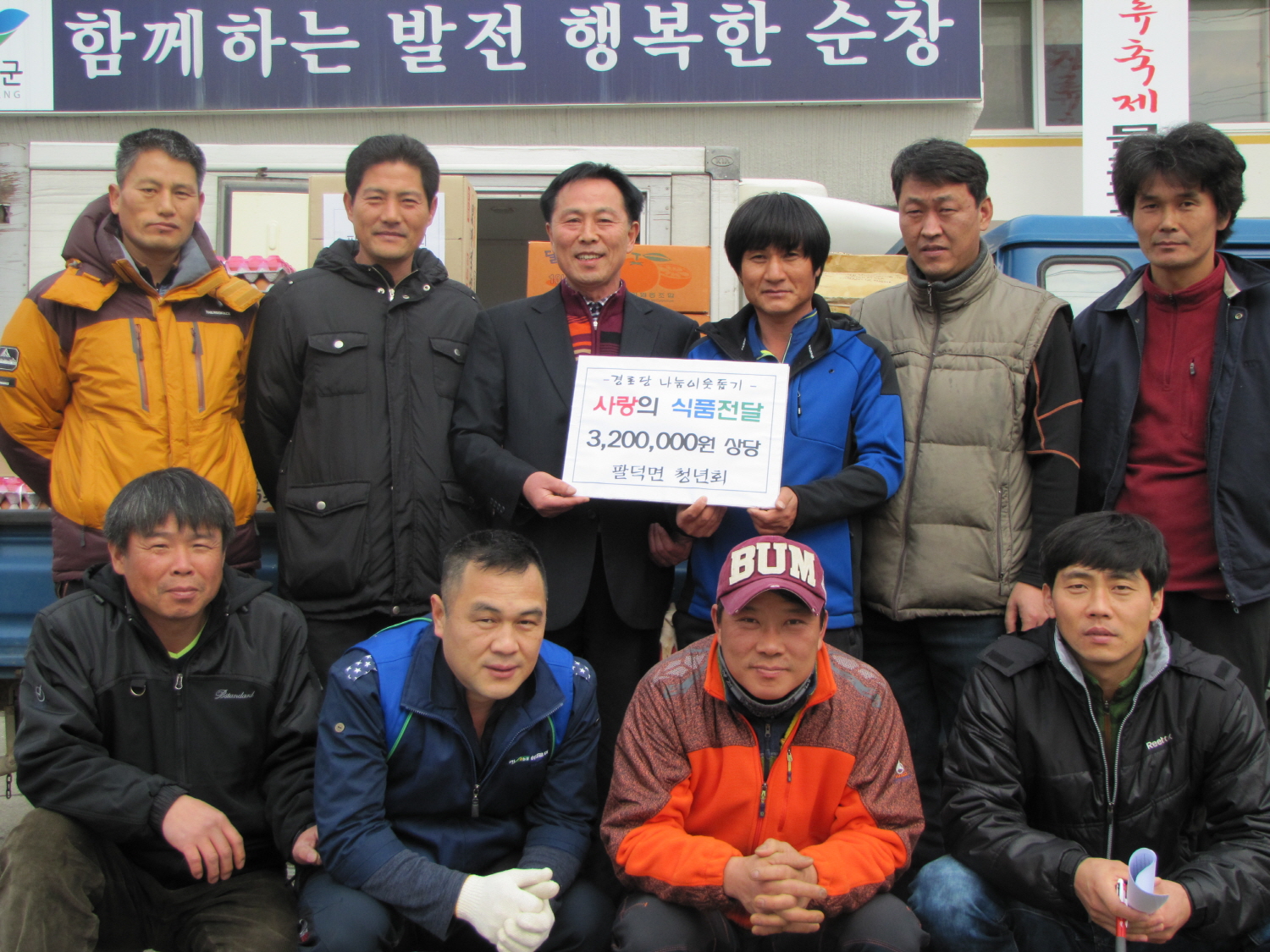 - 순창군 팔덕면 청년회(회장 강종구)는 지난 1일 열린 팔덕면 청년회 일일찻집 행사 수익금으로 320만원 상당의 물품(동태, 계란, 귤, 라면, 커피믹스, 소주)을 관내 23개 할아버지․할머니 경로당에 전달했다. -2013. 12. 30-
