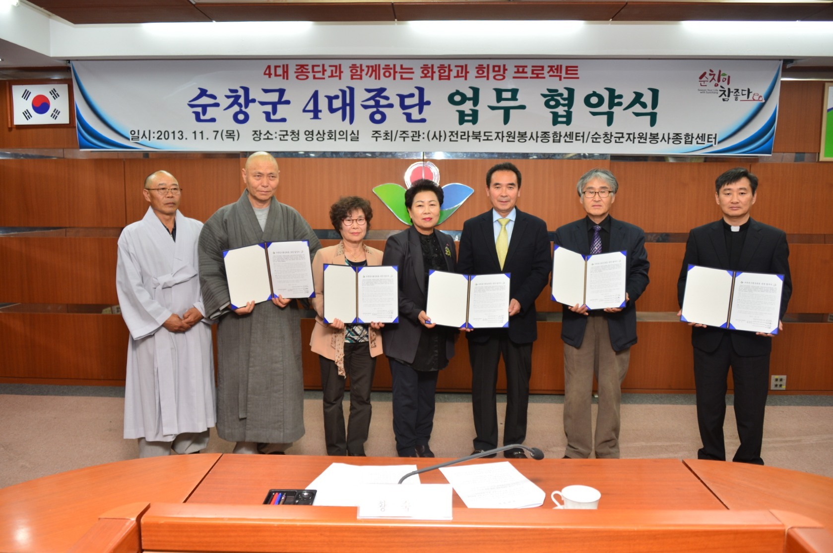 - 순창군자원봉사센터(소장 김영주)는 7일, 기독교연합회(서양원 목사), 불교(법연 스님), 원불교(고세천 교무), 천주교(야고보 신부) 등 순창군 4대종단과 업무 협약식을 가졌다. 4대종단과 함께하는 화합과 희망 프로젝트는 (사)전라북도자원봉사종합센터가 주최, 순창군자원봉사센터가 주관해 추진하는 사업으로 지역의 4대종단이 연대하여 자원봉사 네트워크를 구성함으로써 새로운 자원봉사를 통한 나눔과 참여유도로 종교를 초월한 사회통합과 자원봉사 활성화에 기여하기 위해 추진됐다. -2013. 11. 7-