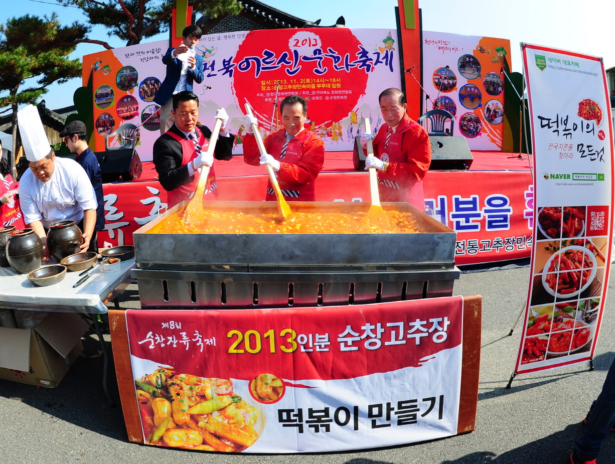 - 제8회 순창장류축제 둘쨋날인 1일 민속마을 한복판에 위치한 축제장 부무대에서는 점심 무렵 2013인분 순창고추장 떡볶이 만들기 행사가 펼쳐져 떡볶이를 맛보기 위해 끝없이 줄을 선 관광객들로 장사진을 이뤘다. 1만7000여명으로 구성된 떡볶이 동호회에서 추진한 이 프로그램은 2013년을 기념해 2013인분의 고추장떡볶이를 관광객들이 직접 만들어보고 먹어봄으로써 순창고추장의 깊은 맛과 온 국민의 기호식품인 떡볶이를 동시에 맛볼 수 있는 체험프로그램이다. 참여 관광객 중 충남에서 온 이모씨(45, 여)는 “떡볶이에는 고추장이 필수적으로 들어가는데 고추장의 본고장인 전라북도 순창에서 순창고추장을 넣어 만든 떡볶이라서 훨씬 더 맛있고 오래도록 이 맛을 잊을 수 없을 것 같다”고 말했다. -2013. 11. 1-