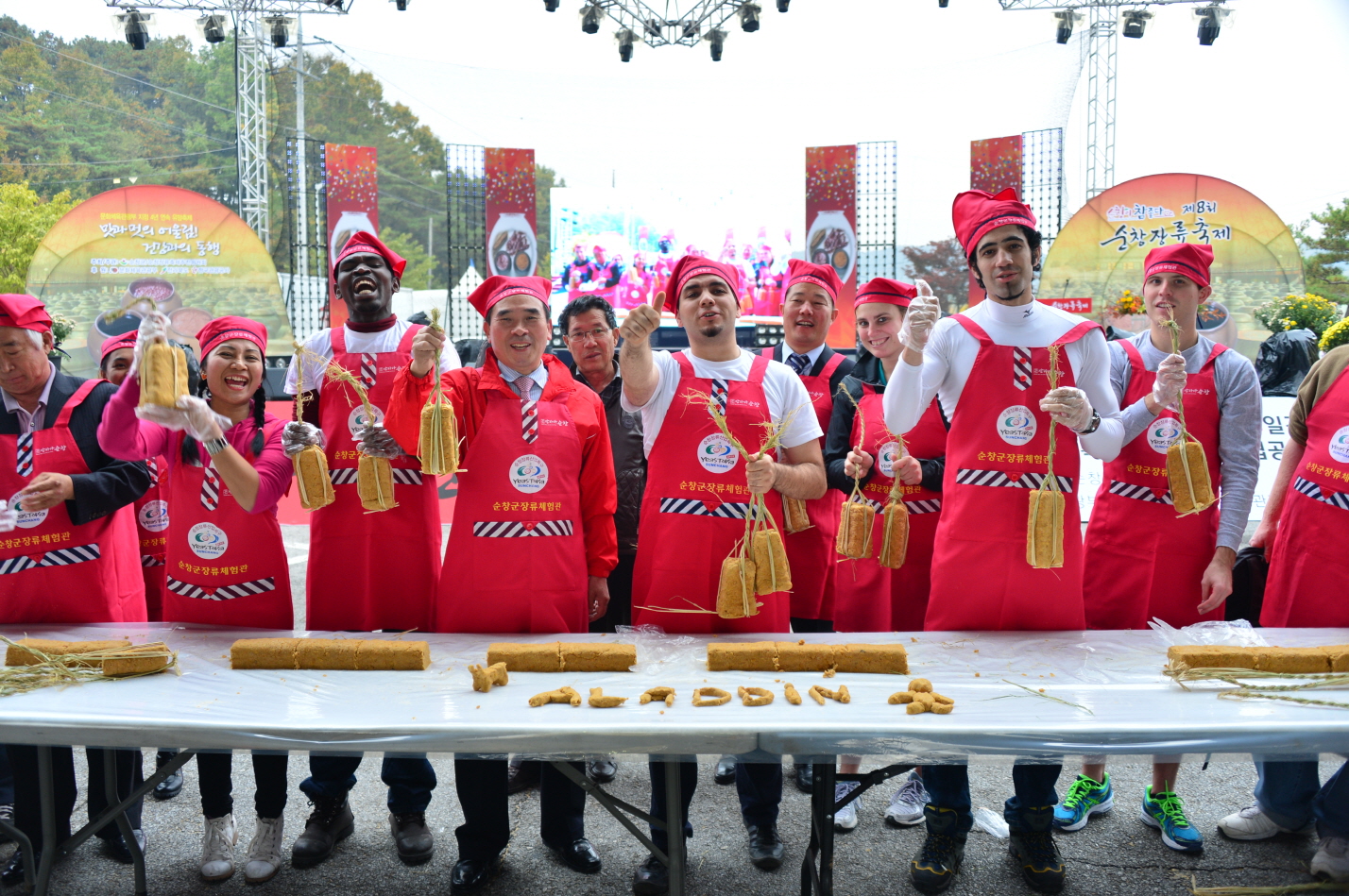 - 제8회 순창장류축제 사흘째를 맞은 2일 축제장 주무대에서는 세상에서 가장 긴 108m 메주만들기 프로그램이 진행돼 축제장을 찾은 많은 지역주민과 관광객들의 관심을 모았다. 황숙주 군수를 비롯 최영일 군의장과 지역주민, 관광객들이 하나되어 도전한 결과 108m 30cm를 기록해 목표했던 세상에서 가장 긴 108m메주만들기를 여유있게 성공했다. 이 프로그램에는 우간다, 시리아, 오스트레일리아, 알제리 등 메주 자체를 처음 보는 외국인 관광객들이 대거 참여해 더욱 눈길을 끌었다. 108m에 성공한 메주는 다시 20cm크기로 썰어 참가자들의 소원을 담은 소원지와 함께 덕대에 매달았다. -2013. 11. 1-