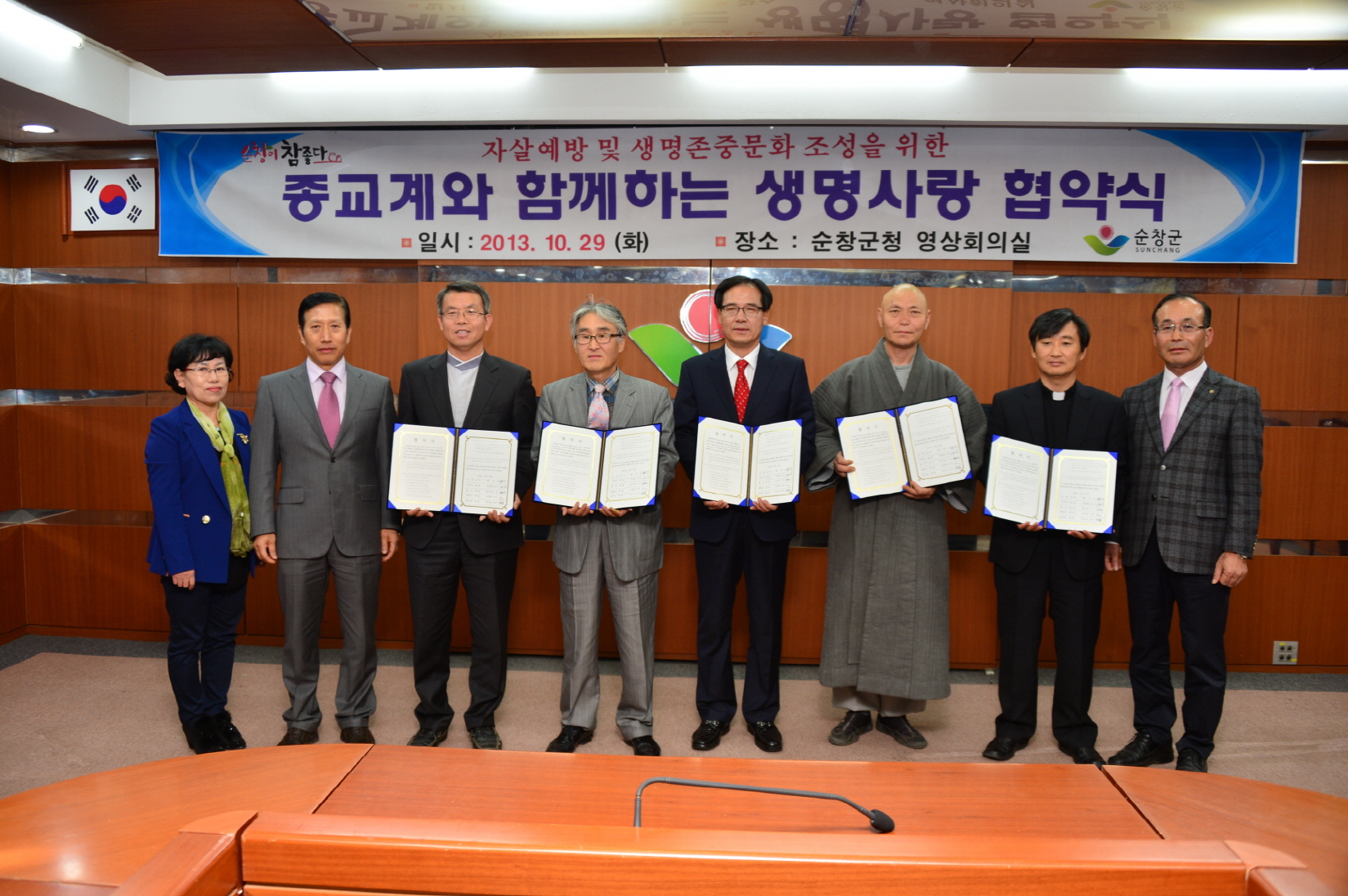 - 29일 군청 영상회의실에서 4대 종단(기독교, 불교, 원불교, 천주교)과 함께 생명존중문화 조성 및 자살률 감소를 위해 생명사랑에 대한 업무 협약을 체결했다. 이날 협약식에는 이강오 부군수를 비롯한 기독교 대표 서양원 목사, 불교계 법연 주지, 원불교 고세천 교무, 천주교 야고보 신부등이 참석한 가운데 열렸다. 앞으로 4대 종단은 종교의례(예배, 법회, 미사등)시 설교, 설법안에 생명의 소중함과 이웃에 대한 관심, 자살예방에 대한 내용을 전달하는 역할을 하기로 약속했다. -2013. 10. 29-