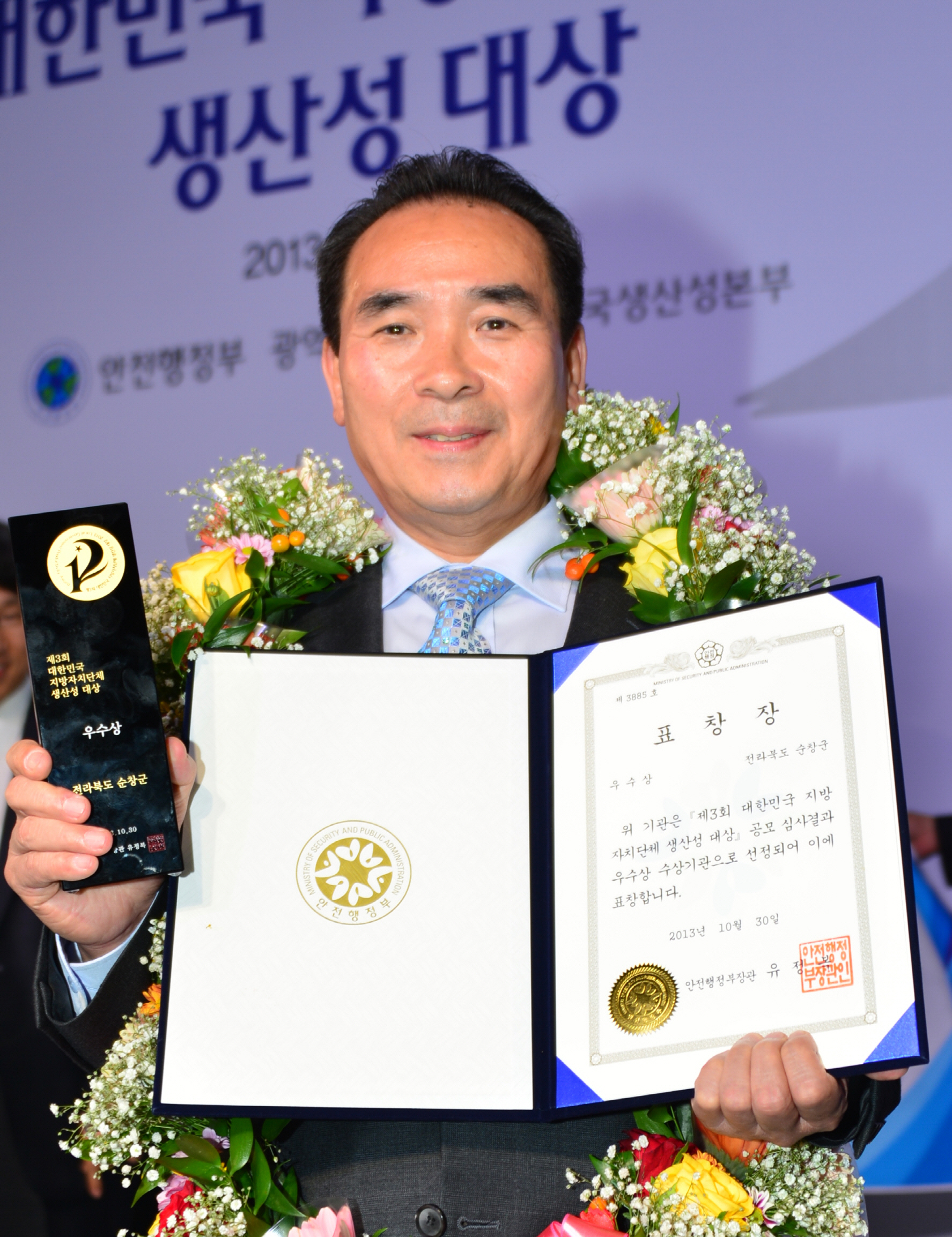 - 안전행정부가 17개 광역 시․도, 한국생산성본부와 공동으로 지방자치단체의 종합적인 행정역량을 측정‧환류해 경쟁력을 높이고자 실시한 ‘제3회 대한민국 지방자치단체 생산성 대상’ 평가에서 순창군이 당당히 전국 우수군으로 선정됐다. 이번 평가는 전국 229개 지자체 중 197개 지자체가 유형별로 자율응모했으며, 이 중 도내에서는 유일하게 전국 5만미만 군(郡)단위에서 순창군이 지난해 한국생산성본부 회장상에 이어 올해는 전국 우수기관으로 선정돼 더욱 값진 성과다. -2013. 10. 30-