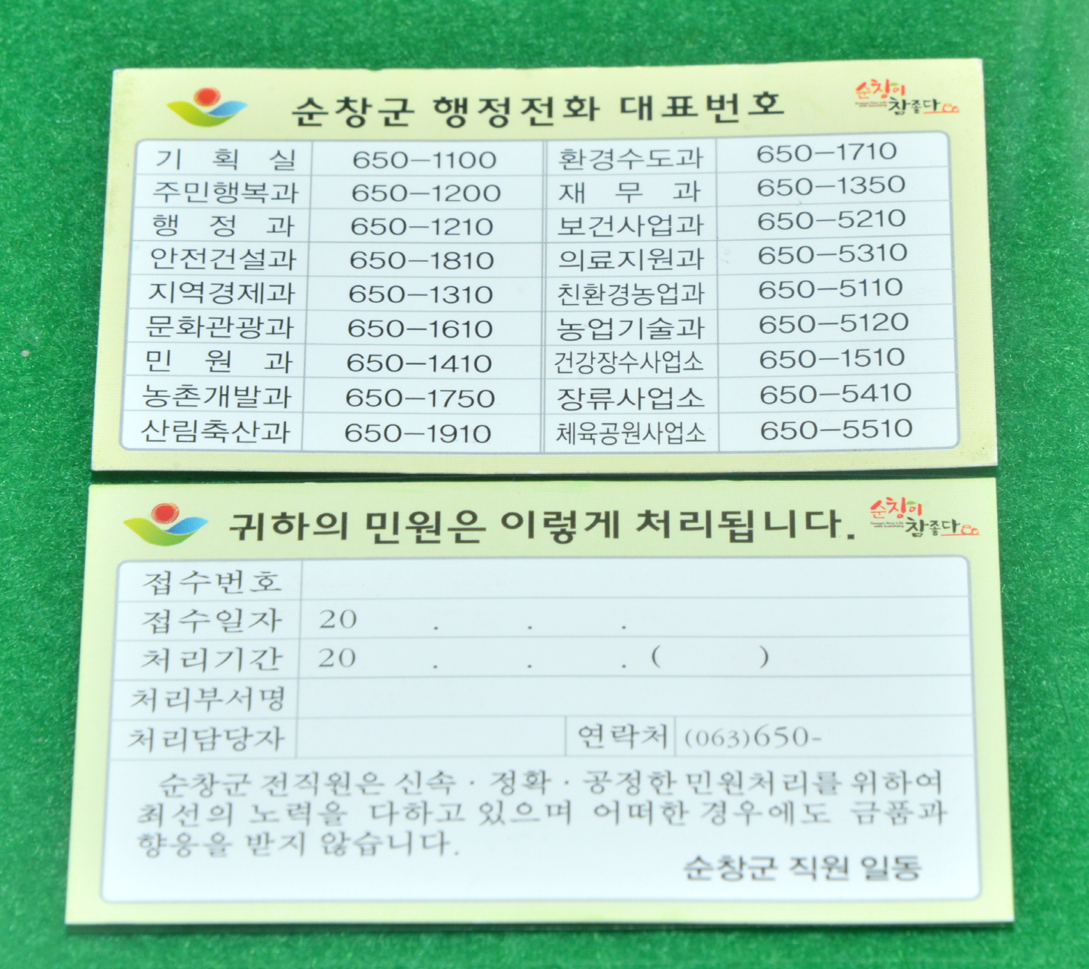 - 민원인에게 처리담당자와 처리기간 명시한 ‘클린민원 명함’ 서비스 제공 한다. 6일 이상 유기한 민원을 접수하는 민원인에게 처리기간과 처리부서, 처리담당자 및 연락처가 기록된‘클린민원 명함’ 서비스를 시작했다. -2013. 9. 16-