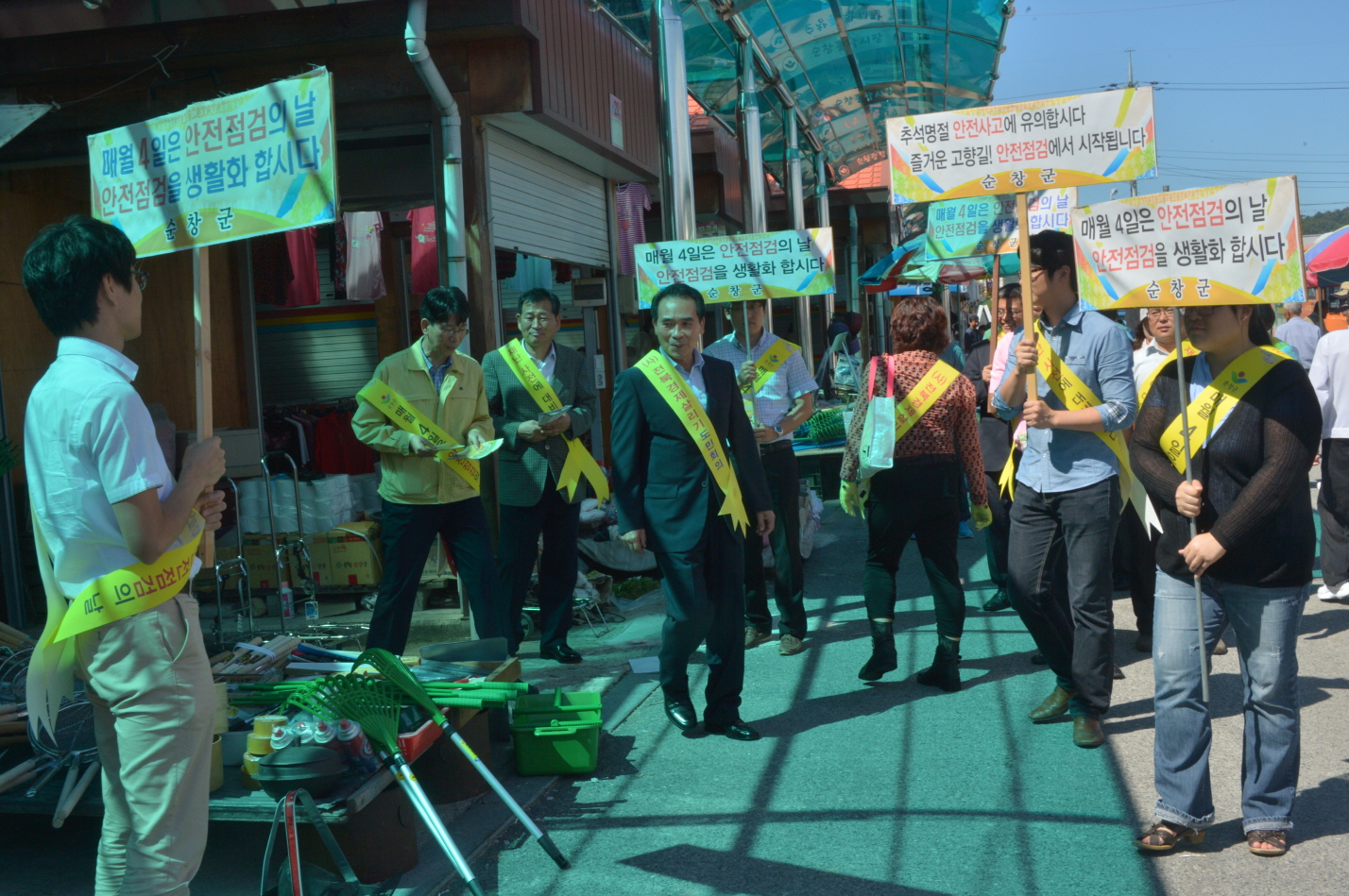 - 민족의 대명절인 추석절을 앞둔 16일 순창장날을 맞아 황숙주군수를 비롯 순창읍 지역자율방재단원과 공무원 등 40여명이 참여한 가운데 ‘즐거운 추석명절 안전에서부터’라는 리플렛을 나눠주며 안전점검의 날 캠페인을 벌였다. -2013. 9. 16-