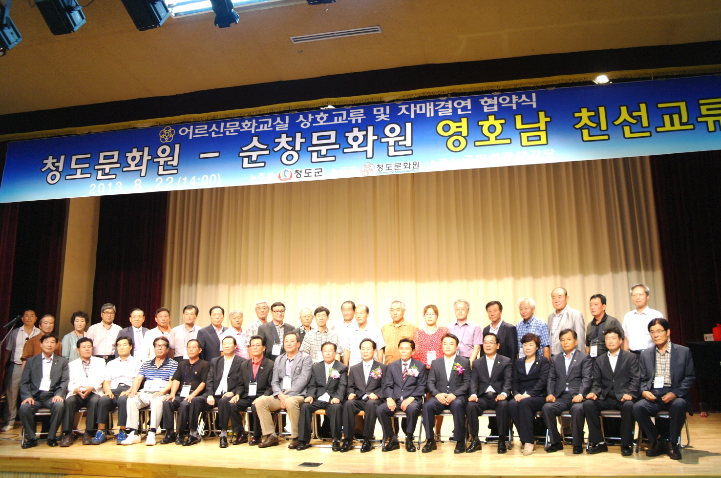 - 순창문화원(원장 김기곤)과 청도문화원(원장 이복수)이 22일 청도문화원 2층 대강당에서 지역문화창달과 영호남문화교류에 있어 협력관계를 수립하기 위한 자매결연 협약식을 가졌다. 이날 협약식에는 이중근 청도군수와 장용기 청도군의회의장을 비롯한 의원 그리고 청도문화원 회원, 순창문화원 임원 및 회원 등 300여명이 참석한 가운데 자매결연협약서 교환과 어르신문화프로그램 문화교류 행사가 이어졌다. -2013. 8. 22-