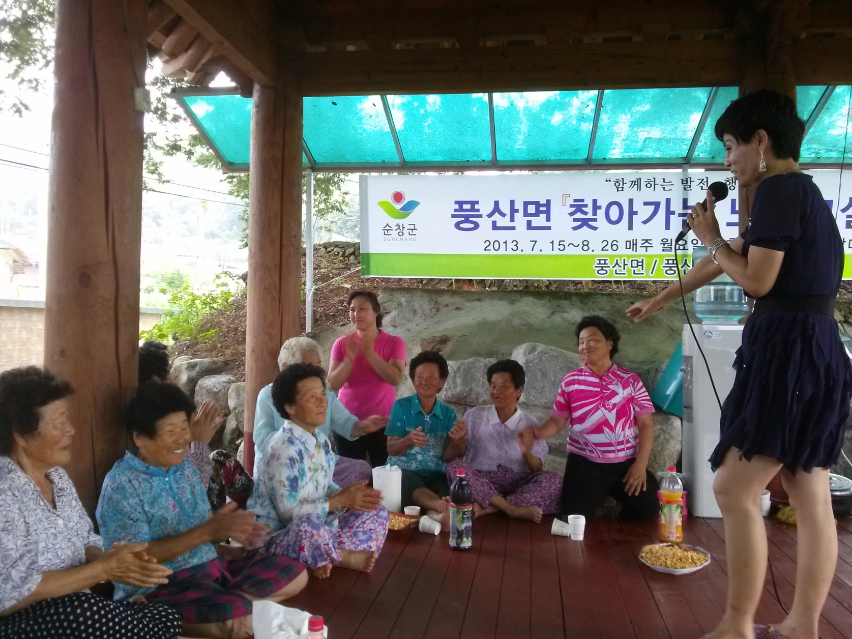 - 풍산면(면장 설제훈)에서는 보다 많은 주민들에게 다양한 문화프로그램 참여기회를 제공하기 위해 ‘찾아가는 노래교실 모정노래방’을 운영, 주민들로부터 큰 호응을 얻고 있다. 모정노래방은 지난달 15일 대가 할머니회관을 시작으로 상촌, 우곡, 소촌, 하죽, 도치, 대가마을 등의 순으로 주민들이 많이 모이는 매주 월요일에 모정을 찾아가고 있다. -2013. 7. 31-
