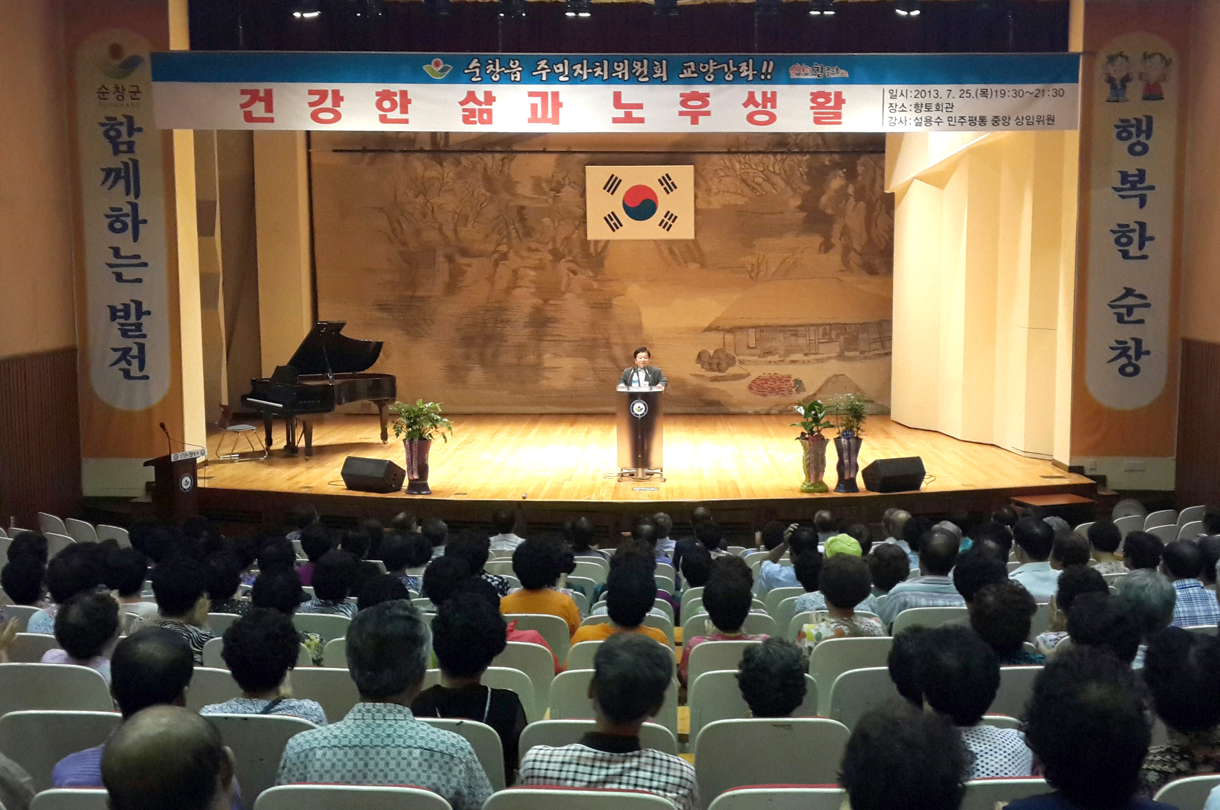 - 순창읍 주민자치위원회(위원장 서한복)가 첫 번째로 주최한 “순창읍 주민자치 교양강좌”가 400여명의 주민이 참석한 가운데 성황리에 열렸다. 25일 향토회관에서 열린 교양강좌는 ‘건강한 삶과 노후생활’이란 주제로 순창출신인 설용수 민주평통 중앙상임위원(전 세계일보 사장)이 누구나 쉽게 실천할 수 있는 건강한 삶에 대해 강의했다. -2013. 7. 25-
