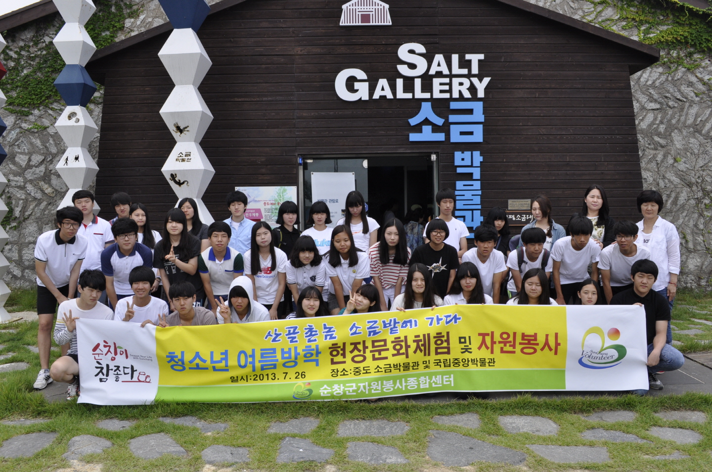 - 순창군 자원봉사종합센터(소장 김영주)는 26일 여름방학을 맞아 관내 우수청소년 40여명을 대상으로 전라남도 신안군 증도에 위치한 소금박물관 견학 체험 및 국립광주박물관 시설을 견학했다. -2013. 7. 26-