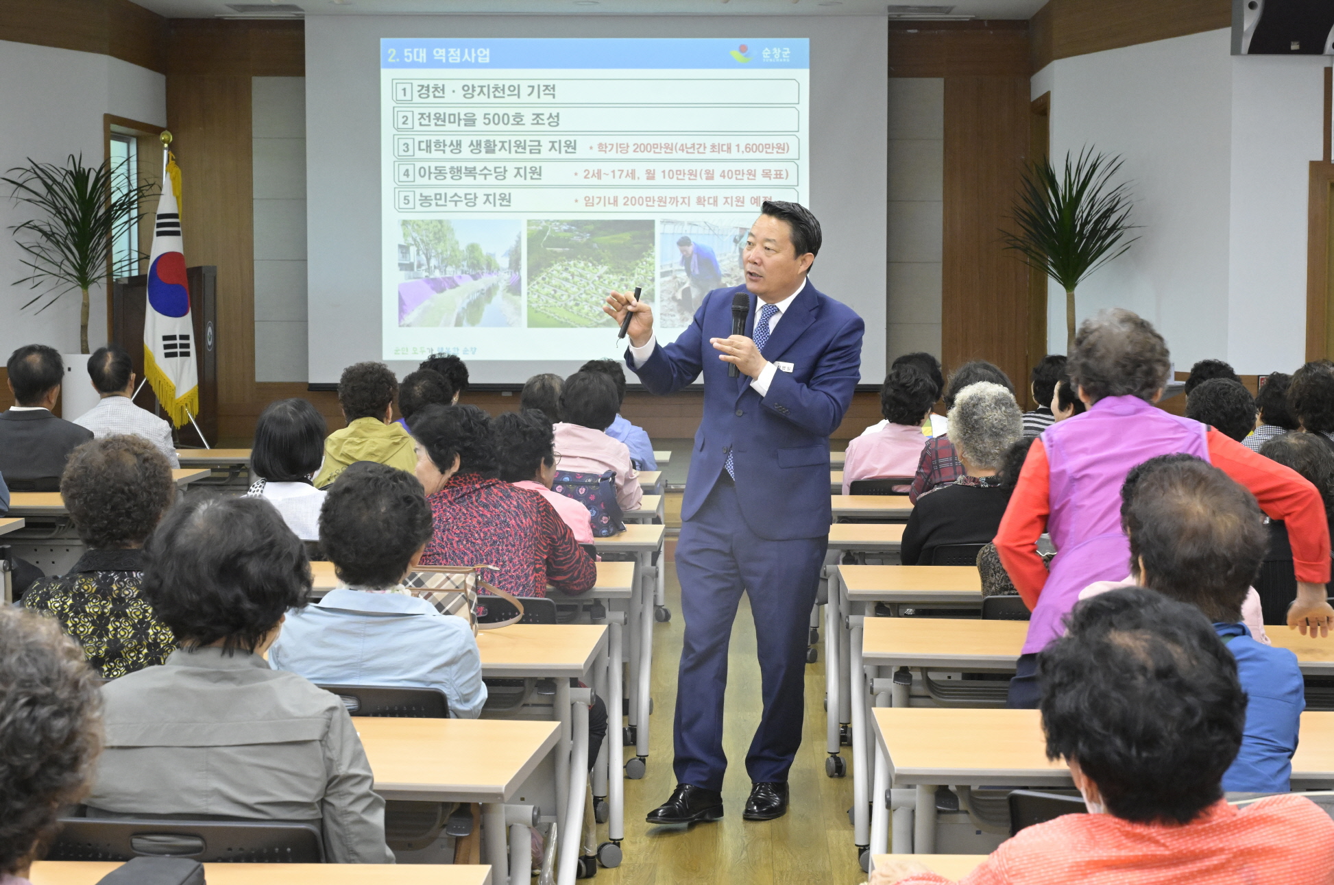 - 16일 최영일 순창군수는 순창군 노인대학(대학장 강병문) 학생들에게‘어르신이 행복한 활기찬 순창’이라는 주제로 특강을 실시했다. 이날 특강에서 최 군수가 강조한 주요 노인복지정책은 △노인 일자리사업 확대 △노인 이·미용비 지원 △보행보조기, 전동차, 난청노인 보청기 지원 △작은목욕탕 활성화 △버스승강장 온열의자 및 선풍기 설치 △쾌적한 노인복지시설 조성 △순창군 공설추모공원 조성 △화장장 남원승화원 공동사용 등 피부에 와닿는 복지정책들로 참석한 어르신들로부터 많은 공감을 불러일으켰다. -2024년 5월 16일-