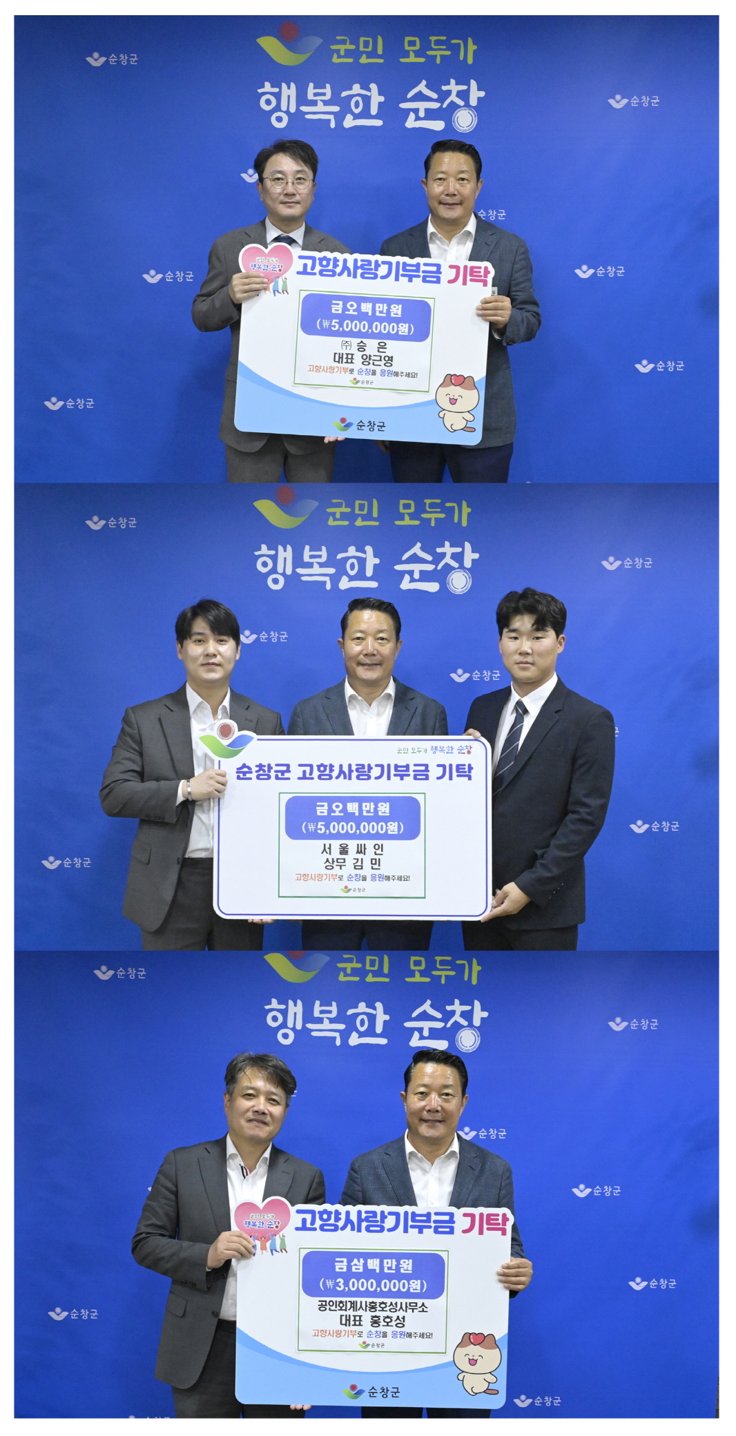 - 17일 ㈜승은 양근영 대표와 서울싸인의 김민 상무가 고향사랑기부금 개인 최고액인 각 500만원, 홍호성 회계사가 300만원을 기탁했다. 서울싸인(상무 김민)은 순창의 대성종합광고기획과 10년 이상 거래를 이어온 업체이며, ㈜승은(대표 양근영)은 2013년 설립된 전주시 소재 관급자재(하천자재) 납품 업체이다. 또 홍호성 회계사는 변호사이자 공인회계사로 순창군 2023 회계연도 결산검사 위원으로 참여 중이다. -2024년 5월 17일-