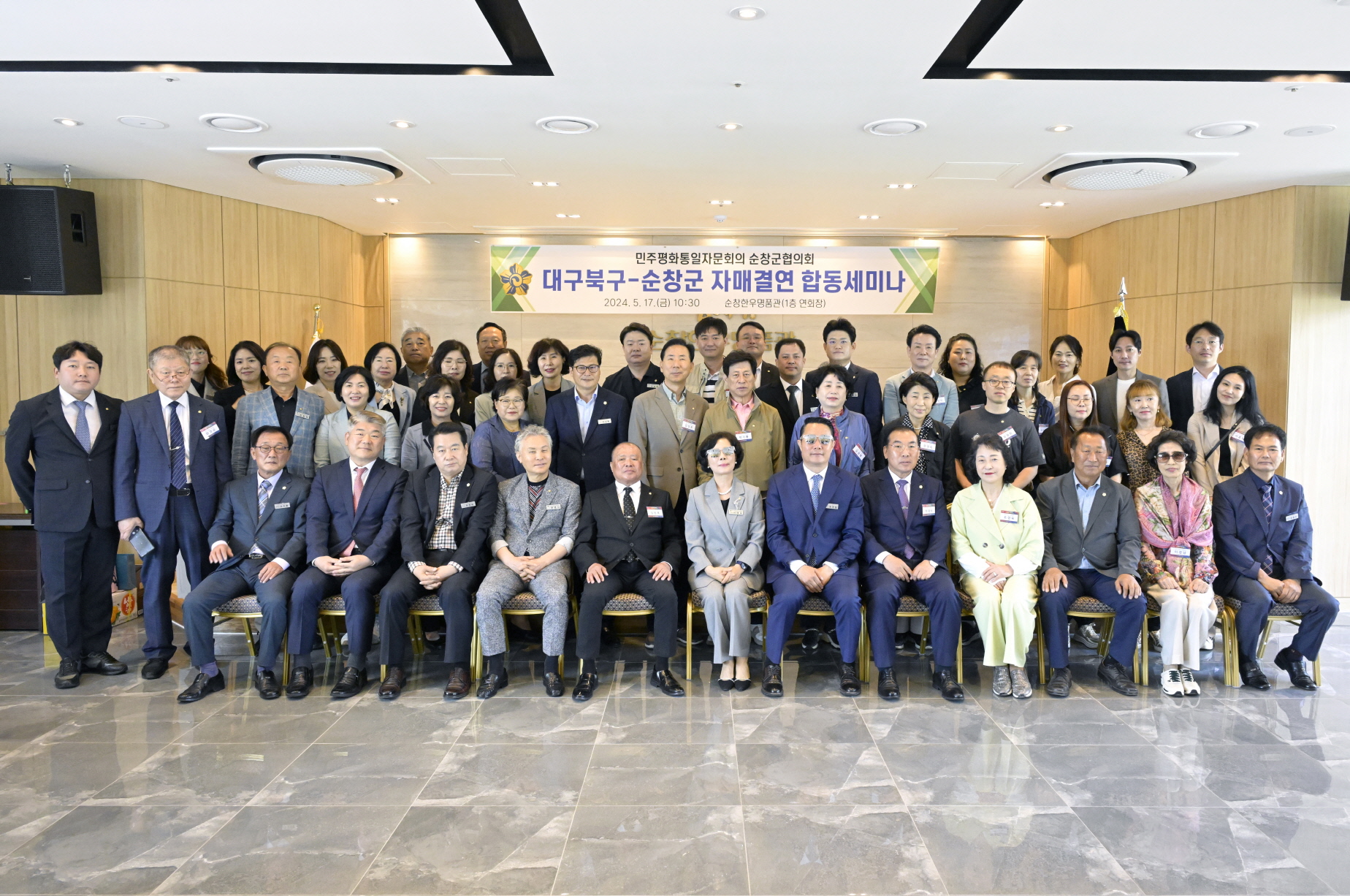 - 민주평화통일자문회의 순창군협의회(회장 서애숙)는 17일 순창한우명품관 연회장에서 양 지역협의회 자문위원 및 관계자 등 70여명이 참석한 가운데 민주평통 순창군-대구북구 자매결연 합동세미나를 개최했다. -2024년 5월 17일-