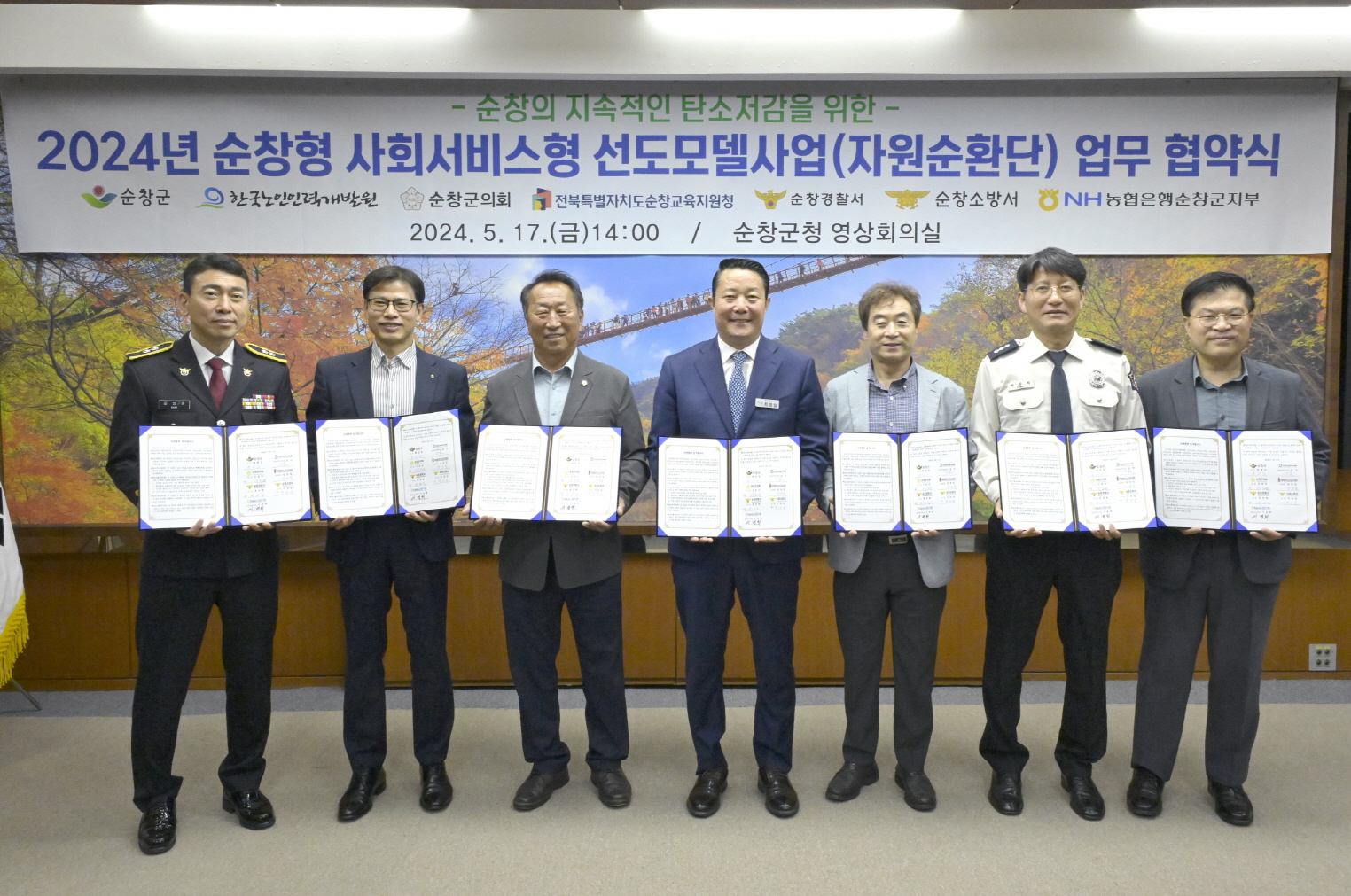 - 17일 군청 영상회의실에서 한국노인인력개발원, 순창군의회, 순창교육지원청, 순창경찰서, 순창소방서, 농협은행순창군지부 등 7개 기관이 함께하는 순창형 사회서비스형 선도모델 사업 협약식을 가졌다. 앞으로 추진하게 될 선도모델사업(자원순환단)은 사업참여자 100명을 선발하고 6월부터 10월까지 5개월간 한시적으로 운영된다. -2024년 5월 17일-