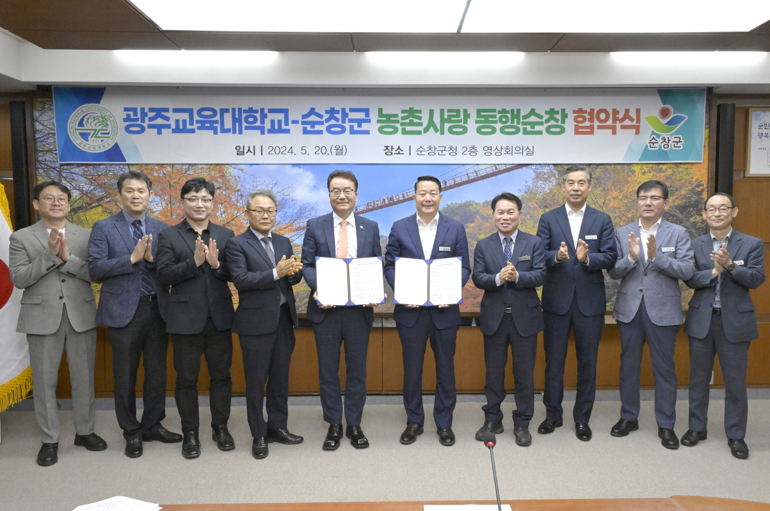 - 20일 광주교육대학교와 도농교류 활성화를 위한 ‘농촌사랑 동행순창’ 협약을 체결하고 상호 교류 활성화와 유기적인 협력체계 구축을 약속했다. 이날 협약식에는 최영일 순창군수, 허승준 광주교육대학교 총장, 두 기관의 관계자들이 참석한 가운데 진행됐다. -2024년 5월 20일-
