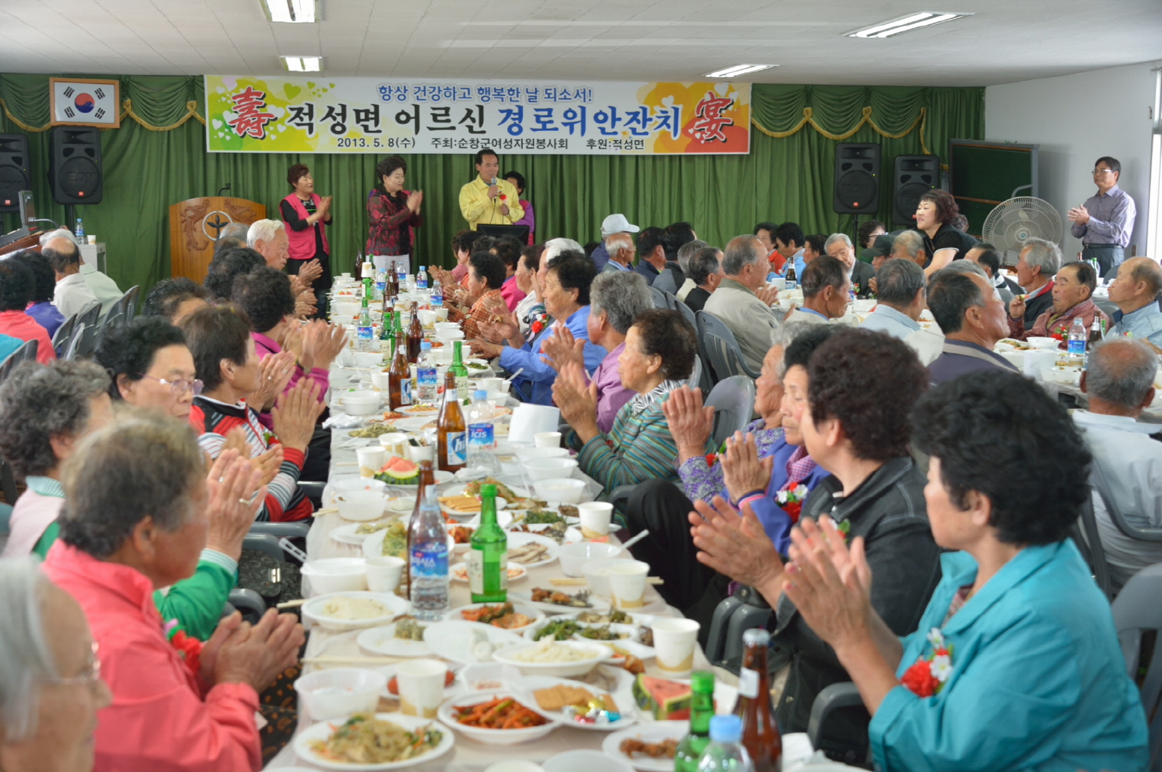 - 순창군 여성자원봉사회(회장 김영주)는 5월 가정의 달을 맞아 8일 적성면 복지회관에서 200여명의 어르신을 초청해 경로위안잔치를 열었다. 이날 어버이날을 맞아 카네이션 꽃을 달아드리고 어버이 은혜에 감사하는 마음을 전했으며, 여성자원봉사회원 50여명이 큰절도 올리고 점심식사와 다과와 함께 자원봉사자들이 노래와 춤 등을 선보이면서 어르신들과 흥겨운 시간을 가졌다. -2013. 5. 8-