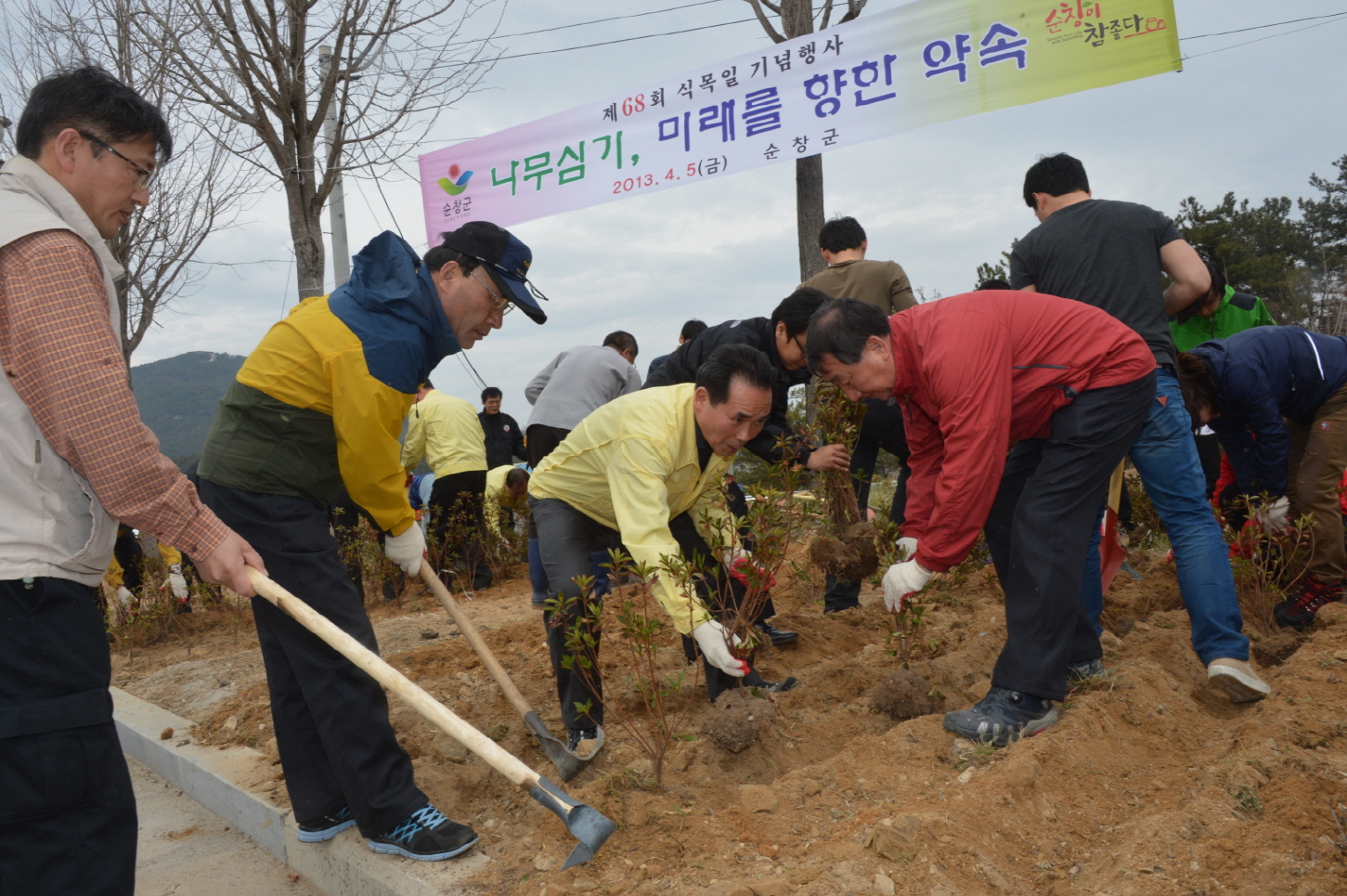 - 순창군이 제68회 식목일을 맞아 5일 공설운동장에서 황숙주 군수, 최영일 군의회 의장을 비롯해 군의원, 공무원 230여명은 기념식을 갖고 화단 주변에 철쭉 1만본을 심었다. 또 건강장수과 20여명도 순창건강장수연구소 주변에 철쭉 200본을 심고 쌍암산림욕장 등산로 정비를 했다. -2013. 4. 5-