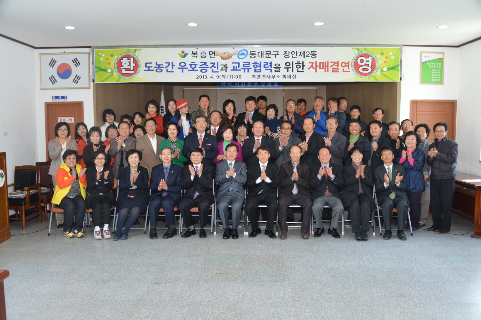 - 순창군 복흥면(면장 윤영길)은 9일 복흥면사무소에서 서울 동대문구 장안2동(동장 양완식)과 자매결연 협약식을 가졌다. 이날 협약식은 장안2동장을 비롯 구의원, 주민자치위원장 등 40여명이 순창을 방문해 도.농 자치단체간 우호교류 및 행정교류를 통한 지역의 공동발전 방향 모색과 농산물직거래 장터 운영 등을 협의했다. 순창군은 동대문구와 2009년 5월에 자매결연을 맺고 다양한 분야의 교류와 정보교환, 농산물 직거래 장터를 활발하게 운영하고 있으며, 지난해 유등면과 제기동, 쌍치면과 전농2동, 순창읍과 종로1~4가동에 이어 이번 복흥면과 장안2동간의 협약식을 맺게 됐다. -2013. 4. 9-