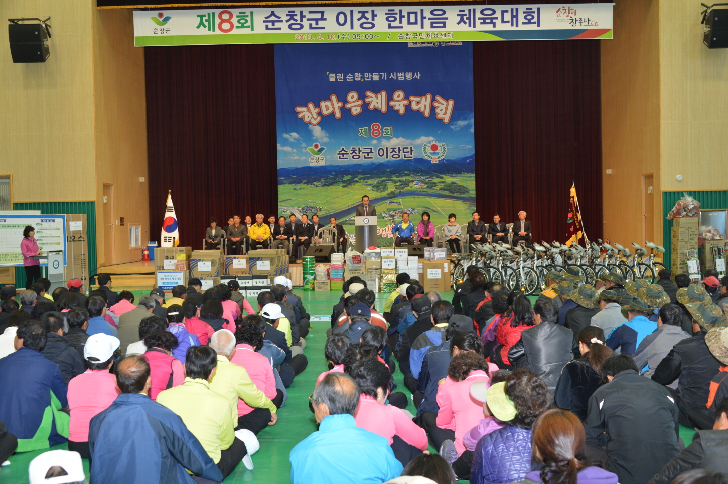 - 순창군 이장단협의회(회장 서성기)는 10일 국민체육센터에서 마을이장 등 600여명이 참석한 가운데 이장 한마음 체육대회를 개최했다. 이날 행사는 씽씽카, 고리걸기 등 체육행사와 화합한마당이 이어졌으며, 클린순창 실천운동도 이뤄져 눈길을 모았다. -2013. 4. 10-