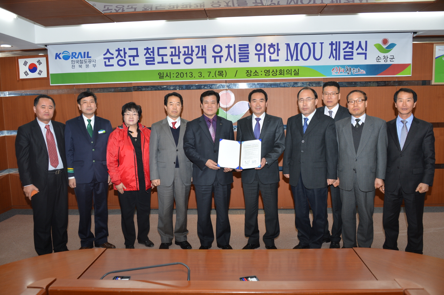 - 순창군이 철도 관광객 유치를 위해 7일 군청 영상회의실에서 코레일 전북본부와 업무협약을 체결했다. 이날 황숙주군수와 김종철 코레일 전북본부장 등 10여명이 참석한 가운데 협약서에 서명하고 순창의 관광자원과 연계한 철도관광객을 유치하기 위해 공동마케팅을 펼치는 등 상호 발전을 위한 사업을 지속적으로 발굴키로 했다. -2013. 3. 7-
