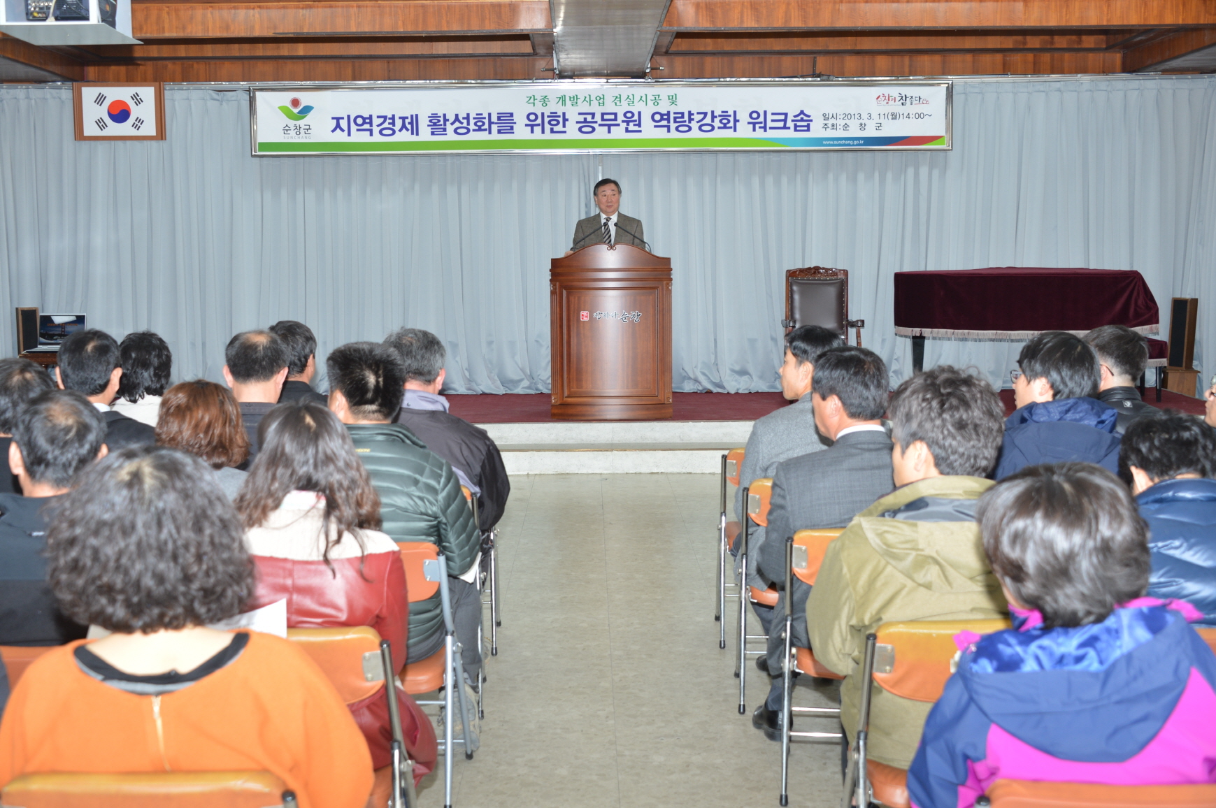 - 순창군은 본격적인 개발사업에 앞서 각종 개발사업 견실시공과 지역경제 활성화를 위해 11일 3층 회의실에서 기술직 공무원과 부읍면장, 공사관계자(시공회사) 등 130여명이 참석한 가운데 공무원 역량강화 워크숍을 가졌다. -2013. 3. 11-