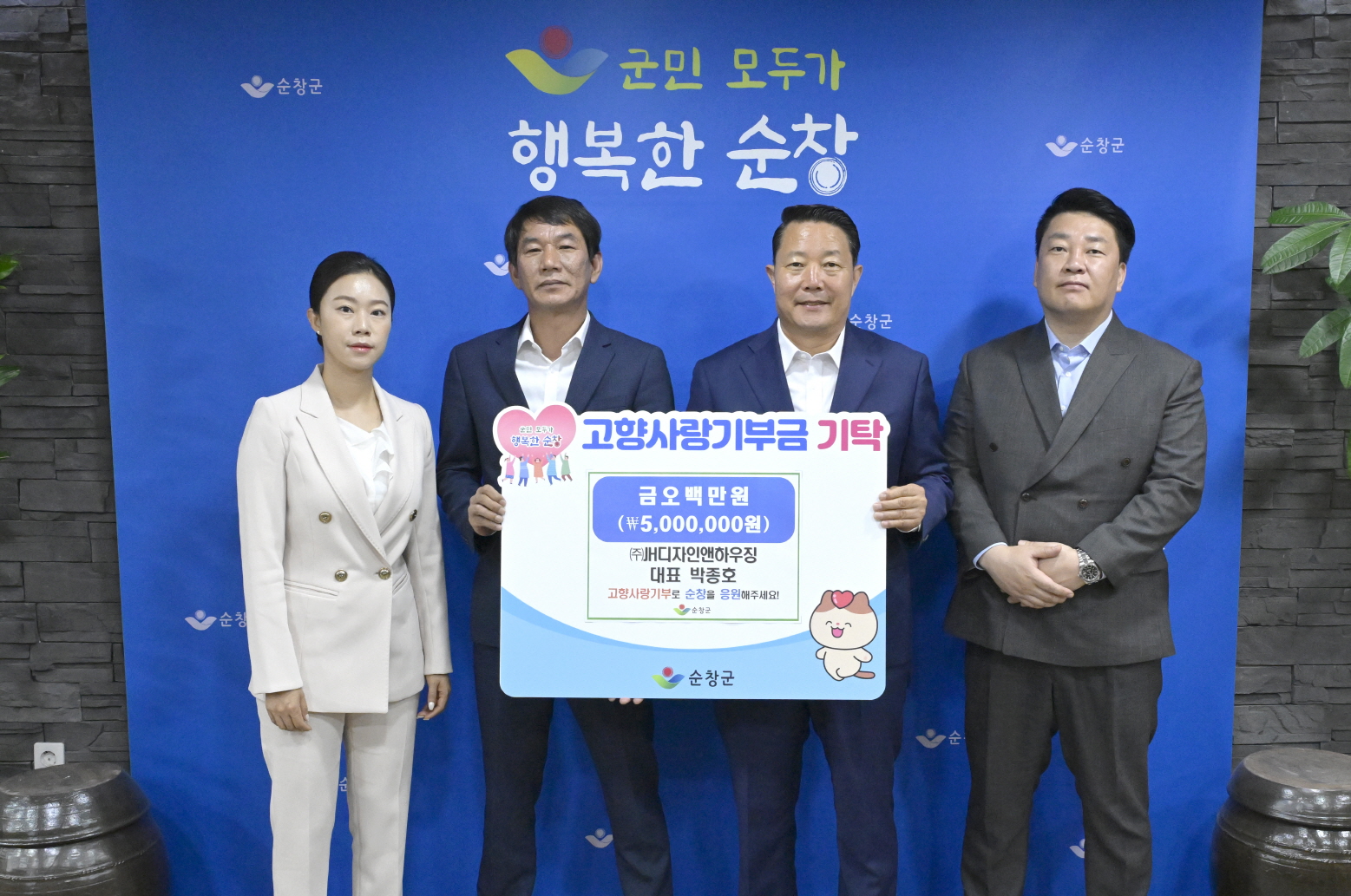 - 3일 ㈜JH디자인앤하우징 박종호 대표가 고향사랑기부금 개인 최고액인 500만원을 기탁했다. 광주광역시 소재 인테리어디자인 업체 ㈜JH디자인앤하우징 박종호 대표는 “태어난 고향이 순창은 아니지만 배우자가 거주하고 있는 순창에 자주 방문하면서 순창에 조금이나마 보탬이 되고자 고향사랑기부에 동참하게 되었다”고 기탁소감을 전했다. -2024년 5월 3일-