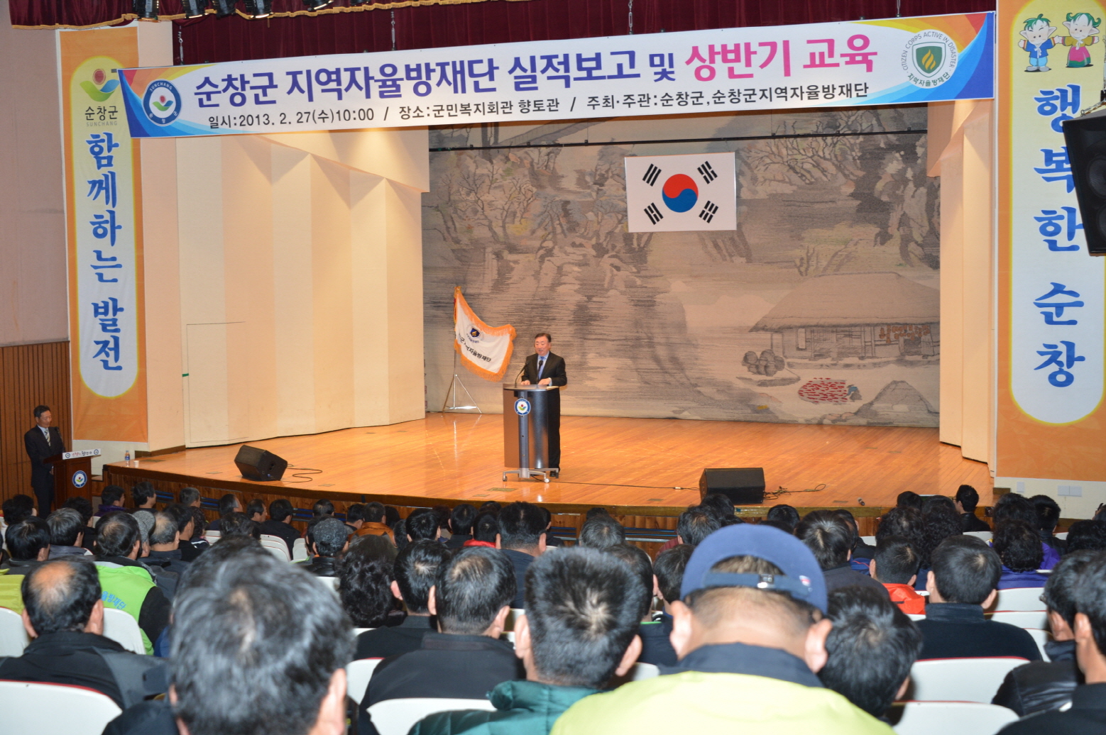 - 순창군지역자율방재단(단장 설기호)이 27일 군민복지회관 향토관에서 경선 순창부군수, 최영일 순창군의회 의장, 오은미 도의회 의원 등 기관단체장과 순창군 지역자율방재단원 등 630여명이 참석한 가운데 2012년 한해동안 활동실적 보고회를 가졌다. 순창군지역자율방재단은 자연재해대책법에 근거해 2008년 5월 창립했으며, 단장을 비롯해 11개읍면 610명으로 구성되어 있다. -2013. 2. 27-