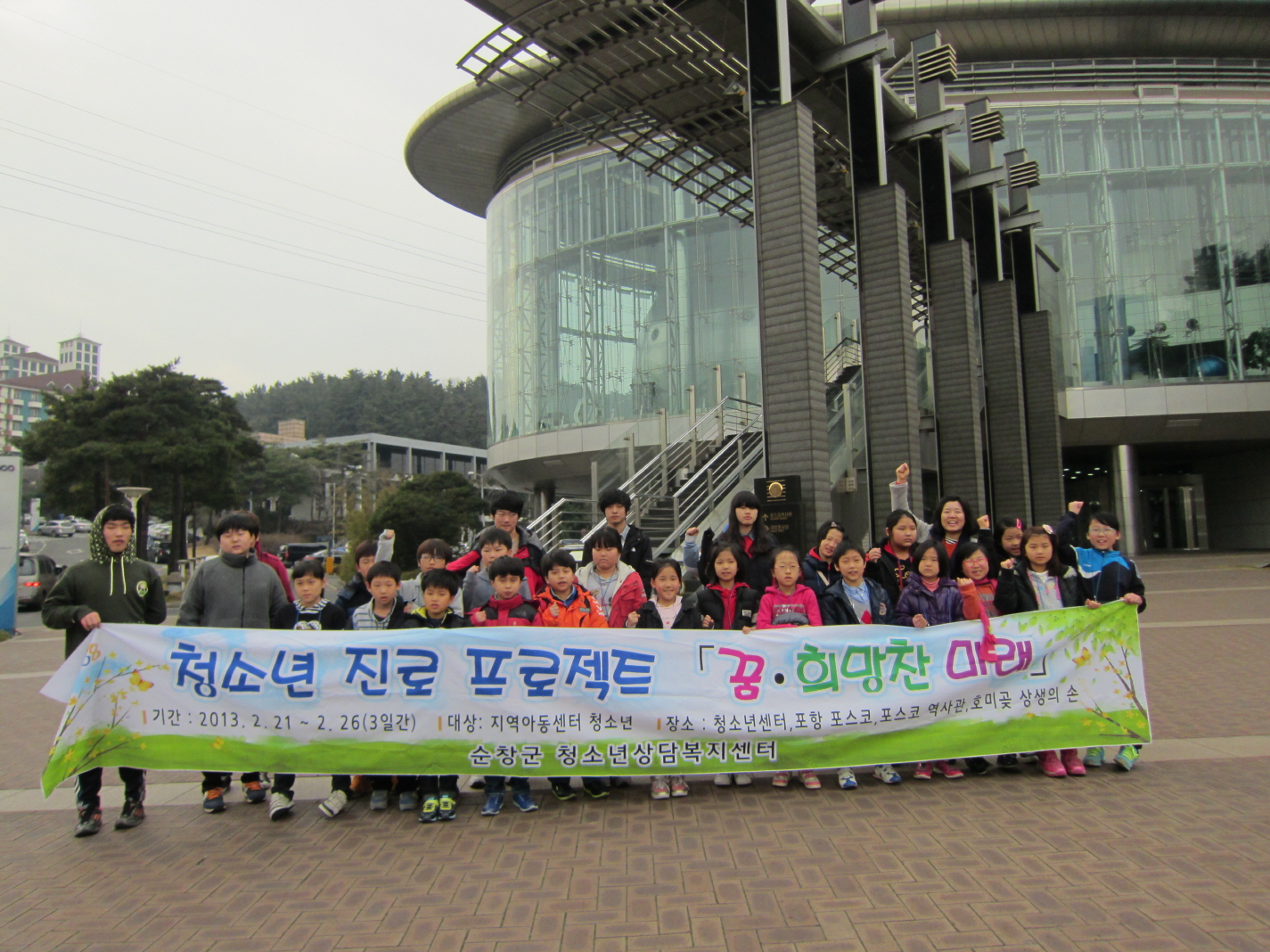 - 순창군 청소년상담복지센터에서는 관내 지역아동센터 아동.청소년 40명을 대상으로 진로프로젝트 ‘꿈! 희망찬 미래’ 프로그램을 운영했다. 진로프로젝트는 학기말 방학을 이용해 아동청소년에게 희망찬 미래에 대한 비전을 제시하고 다양한 직업세계와 진로정보 제공을 함으로써 청소년들의 의식전환의 장을 마련하고자 추진됐다. 21일과 22일에 실시한 1~2일차는 청소년들의 진로탐색을 통한 직업의 이해를 돕기 위해 청소년센터에서 진행됐고, 3일차인 26일은 포항 포스코를 견학하는 직업현장체험으로 진행됐다. -2013. 2. 27-