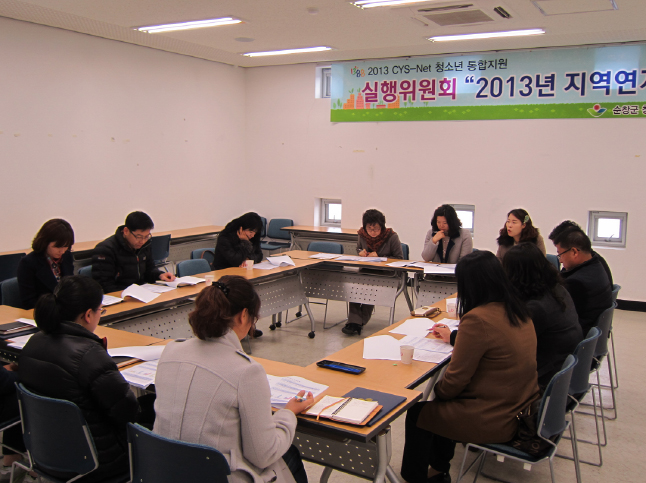- 순창군 청소년상담복지센터(센터장 정재환)는 22일 청소년통합지원체계를 통한 지역내 위기청소년 발굴 및 지원을 위해 제1차 실행위원회 운영회의를 가졌다. 운영회의에는 경찰서, 교육지원청 등 유관기관과 사회단체 담당자 등 지역내 청소년통합지원체계(CYS-Net) 구성 위원 13명이 참석한 가운데 열렸다. -2013. 2. 22-
