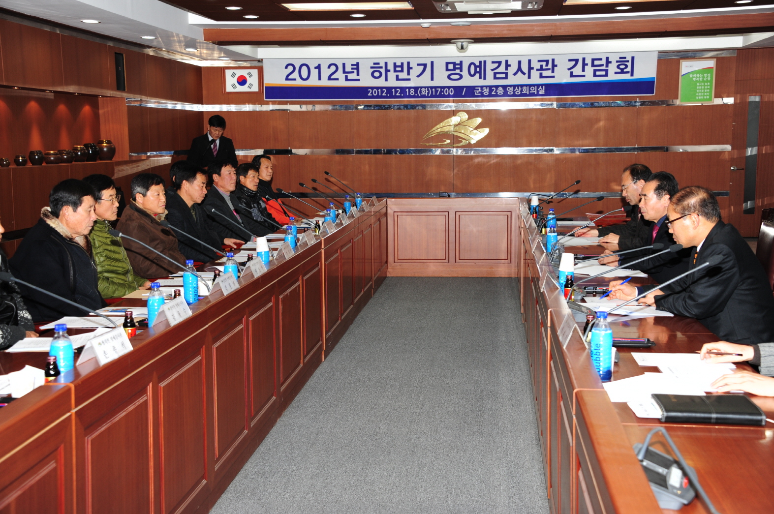 - 18일 군청 영상회의실에서 황숙주 순창군수를 비롯한 군 간부공무원과 읍면 명예감사관 등 20여명이 참석한 가운데 하반기 명예감사관 간담회를 가졌다. 명예감사관은 생활현장의 위법.부당사항, 부정.부패행위, 우수 수범사례를 신고할 수 있으며, 불친절한 행위, 금품.향응수수 행위를 비롯, 공무원의 품위손상 등 기타 위법.부당행위 등도 신고하는 등 순창군 전반에 걸친 감시와 견제를 하고 있다. 이날 간담회에서는 지난 5월부터 9월까지 명예감사관이 건의한 사항에 대한 처리결과와 함께, 올해 감사운영 주요성과, 내년도 감사운영 방향 및 중점과제에 대한 설명도 있었다. -2012. 12. 18-