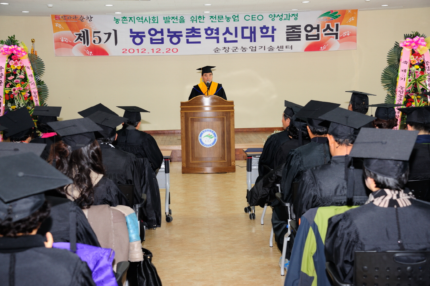- 순창군이 농촌지역사회의 발전을 선도할 정예핵심리더의 지속적인 양성을 위해 20일 농업기술센터에서 황숙주 군수를 비롯한 졸업생과 가족 등 100여명이 참석한 가운데 제5기 농업농촌혁신대학 졸업식을 가졌다. 이날 졸업한 45명의 학생들은 지난 1월 10일 50명이 입학해 농한기인 1월~3월, 11월에 농산물마케팅, 친환경농업을 중심으로 농촌개발, 농촌관광, 리더십, 교양과목 등 34강좌를 수강했다. -2012. 12. 20-