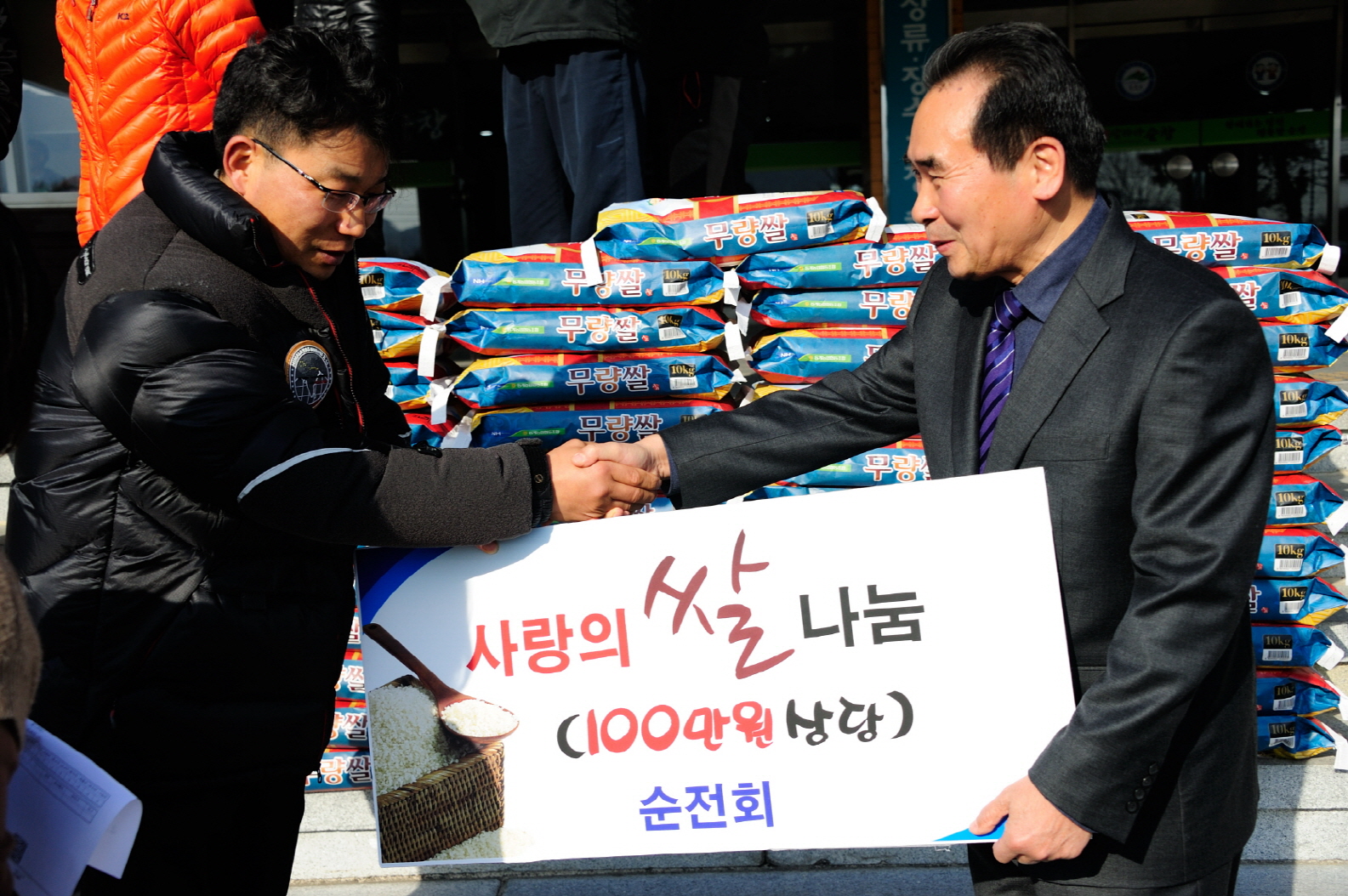 - 순창전업사회(회장 권용옥)는 연말에 독거노인과 소년소녀가장 및 다문화가족 등 소외계층에 대한 사회적 관심을 유도하고자 20일 순창군청을 찾아 황숙주 순창군수에게 사랑의 쌀 45포대(10kg/100만원 상당)를 전달했다. -2012. 12. 20-