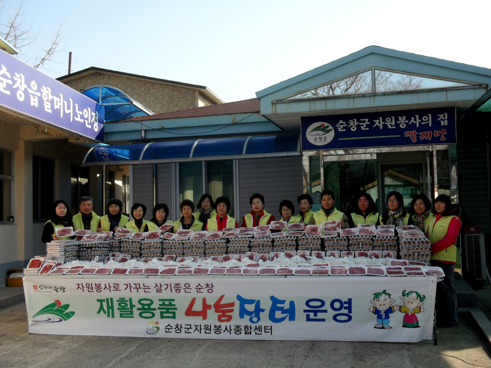 - 순창군자원봉사센터는 20일 재활용품 나눔장터를 운영한 수익금을 활용하여 관내 다문화 가족과 독거노인 및 어려운 이웃들에게 전달하며 온정을 전했다. 또 시장고기간에서(대표 전기룡)돼지고기 100근, 동계면 신흥리 황금축산영농조합법인(대표 황인수)에서 계란 100판을 기증받아 밑반찬과 함께 소고기 50근, 떡국떡 180kg과 함께 전달하였다. -2012. 12. 20-