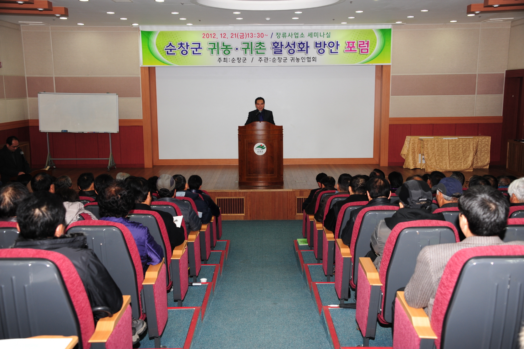 - 순창군이 최근 급증하고 있는 귀농.귀촌 추세에 대한 대응 방안을 마련하기 위해 귀농.귀촌 활성화 방안 포럼이 21일 장류사업소 세미나실에서 전문가, 귀농귀촌인, 지역리더자 등 200여명이 참석한 가운데 개최했다. 이번 포럼은 ‘귀농귀촌 활성화방안’이라는 주제로 지역민과 화합하고 소통할 수 있는 계기를 마련하기 위한 행사로, 전국 귀농본부 전희식 대표와 농촌으로 가는 길 성여경 대표, 이구연 농정과장이 좌장을 맡아 주제발표와 질의 응답 시간을 가졌다. -2012. 12. 21-