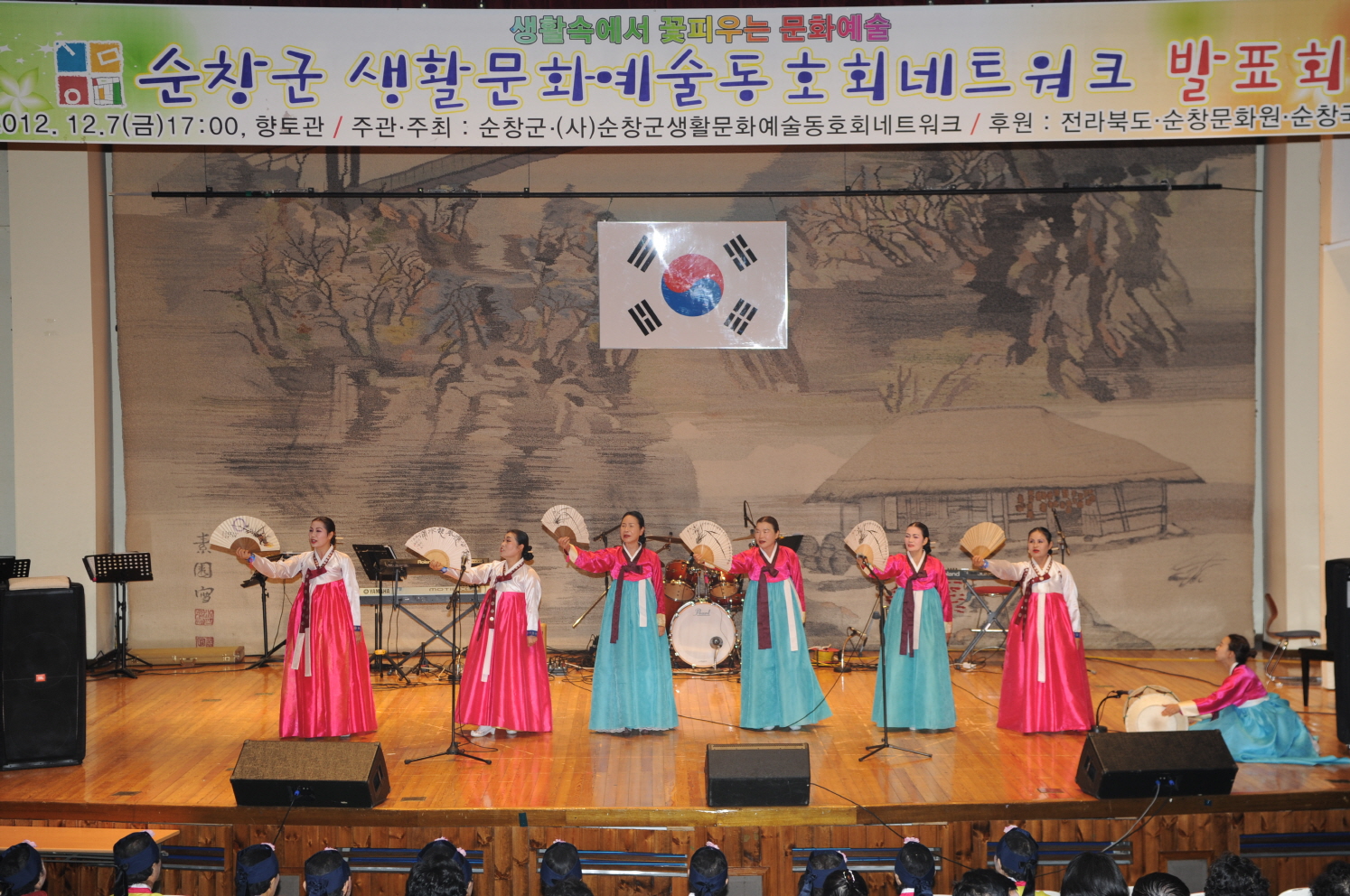 - 7일 군민복지회관 향토관에서 ‘생활문화예술동호회 전시.체험.공연발표회’를 가졌다. (사)순창군 생활문화예술동호회(위원장 김기곤)가 주관한 이날 행사는 지난 5월 24일 생활속에서 문화예술을 함께 나누는 음악, 합창, 무용 등 8개분야 24개 순창군 생활문화예술동호회네트워크 동호회 500여명을 구성원들이 참여한 가운데 열렸다. 발표회는 어울마당 사물놀이, 장수춤, 스포츠댄스, 민요, 플룻, 방송댄스 등 15개 프로그램 공연과 소품.악세사리 등을 무료로 체험할 수 있는 한지공예와 가죽공예 등도 운영되어 생활문화예술인들의 한마당 잔치가 되었다. -2012. 12. 7-