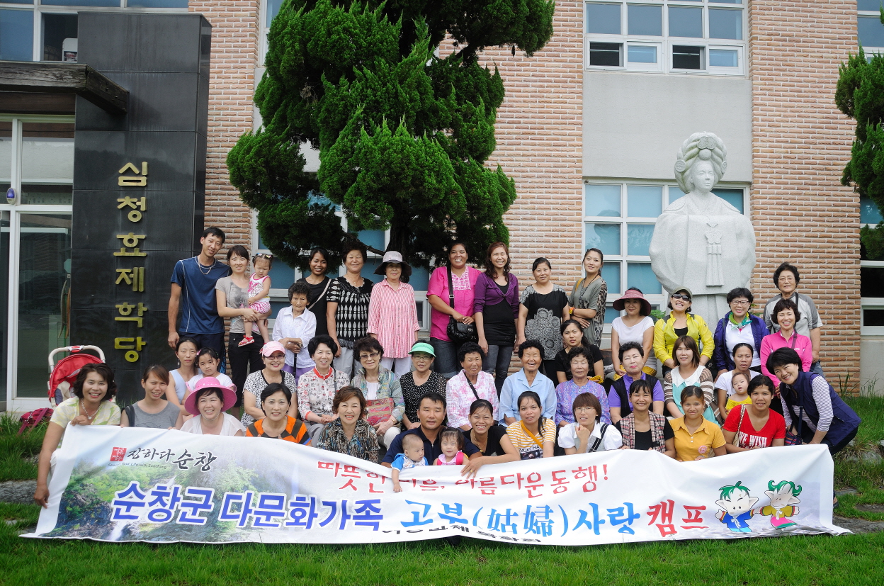 - 순창군 여성단체 목화회(회장 윤오순)는 20일 관내에 시어머니와 며느리가 같이 생활하는 다문화가정을 대상으로 함께 사랑을 나누는 고부(姑婦)사랑 캠프를 실시했다. 고부사랑 캠프는 가족간 정이 갈수록 메말라가는 추세에 특히 살아온 문화가 다른 고부간의 작은 갈등도 해소시키기 위해 실시됐다. 이날 캠프는 다문화가정 40여명과 목화회 회원 20여명 등 60여명이 참여해 고부간 세대차이를 극복하고 서로가 공감하며 생각을 이해할 수 있는 시간을 가짐으로써 가족간 정을 돈독히 하는 계기를 마련했다. -2012. 8. 20-