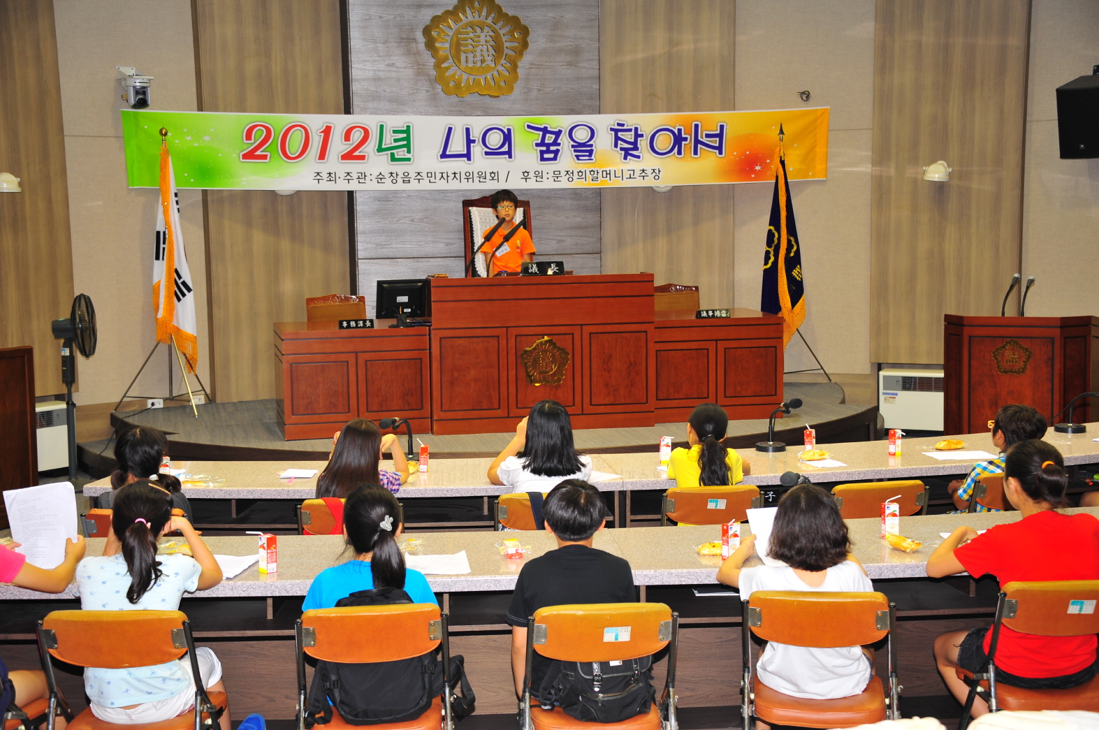 - 순창읍주민자치위원회(위원장 서한복)는 ‘2012년 우리의 꿈을 찾아서’ 라는 주제로 나의 꿈 그리기, 나의 꿈 말하기 행사를 하였다. 24일 순창군의회 본회의장과 군청 회의실에서 진행된 이번 행사는 읍 소재 3개 초등학교에서 64명이 참여한 가운데 1~4학년은 ‘나의 꿈 그리기’를, 5~6학년은 ‘나의 꿈 말하기’로 진행됐다. -2012. 7. 24-