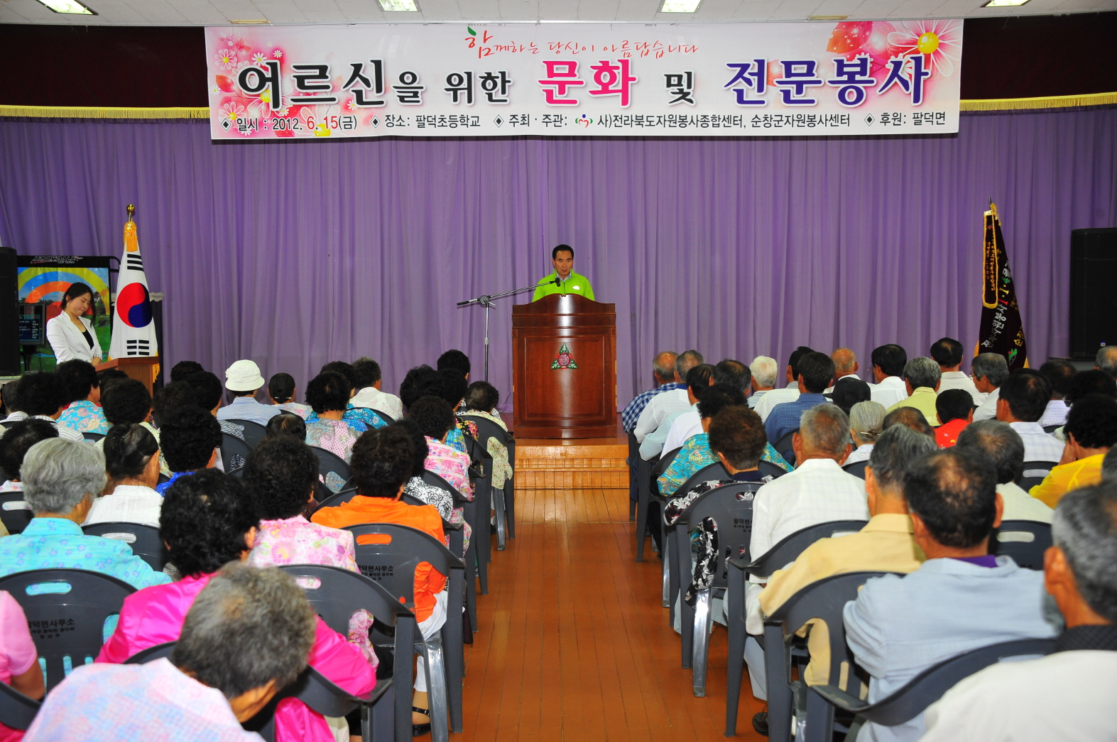- 순창군자원봉사센터에서 15일 어르신을 위한 문화 및 전문봉사서비스 행사를 팔덕면 초등학교 강당에서 (사)전라북도자원봉사종합센터(이사장 김기원)에서 주최하고 순창군자원봉사종합센터(소장 김영주)에서 주관한 가운데 열렸다. 이날 황숙주 순창군수를 비롯해 면기관단체장, 팔덕면 어르신 등 300여명을 참여한 가운데, 어르신들에게는 이동급식차량을 통해 다과와 점심식사를 대접하였다. 이날 문화공연과 어르신들의 노래자랑이 이어졌으며, 전문봉사단은 서금요법, 발 맛사지, 이․미용봉사, 쑥뜸, 귀반사 등 봉사단이 전문봉사활동을 펼쳐졌다. -2012. 6. 15-