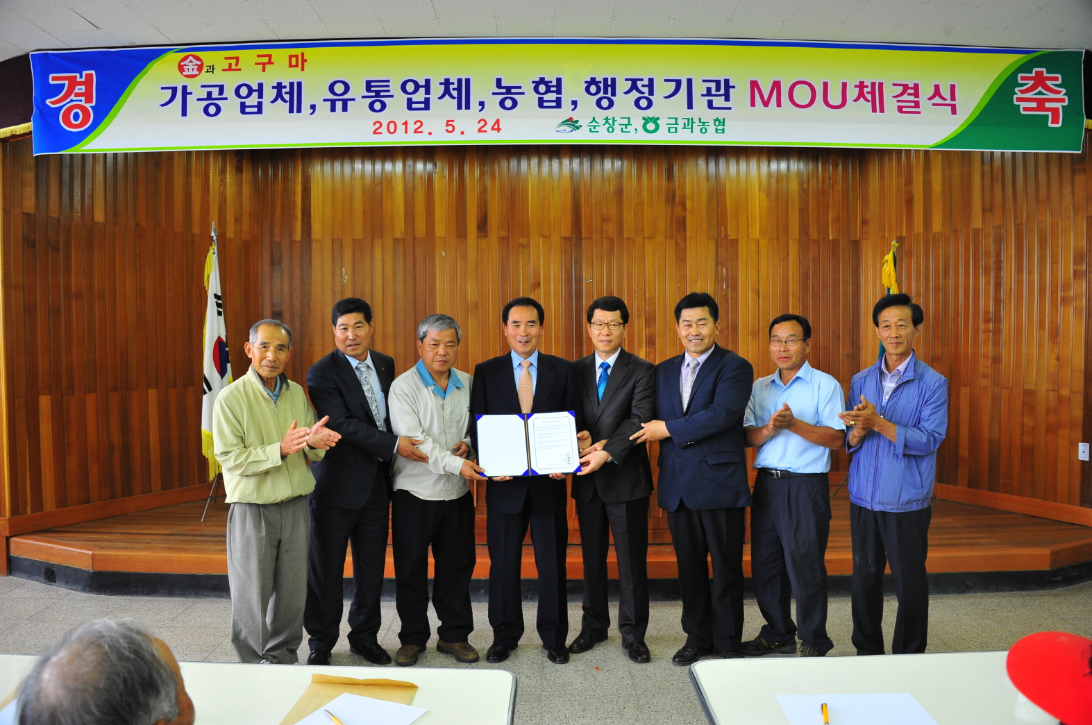 - 금과고구마 유통협약식이 24일 금과면(면장 허관욱)주관으로 금과농협 회의실에서 가공업체와 유통업체, 농협, 행정기관 등 4개기관의 MOU 체결식을 가졌다. 이날 협약식에는 황숙주 군수를 비롯해 전분가공업체 (주)서안(대표 이병수) 유동건 전무, 강서농산물공판장(대표 유택신) 임연태 팀장, 농협중앙회 도매사업부(부장 권기춘) 김오식 팀장, 금과농협(조합장 조현표)고구마작목반 공황규 반장, 고구마 생산농가 등 100여명이 참석했다. 웰빙식품인 금과고구마는 청정지역 순창에서도 황토땅으로 유명한 금과에서 나는 대표 특산물로, 군은 금과의 지리적 강점을 활용한 브랜드 전략으로 고구마 판매를 극대화시킬 방침이다. -2012. 5. 24-